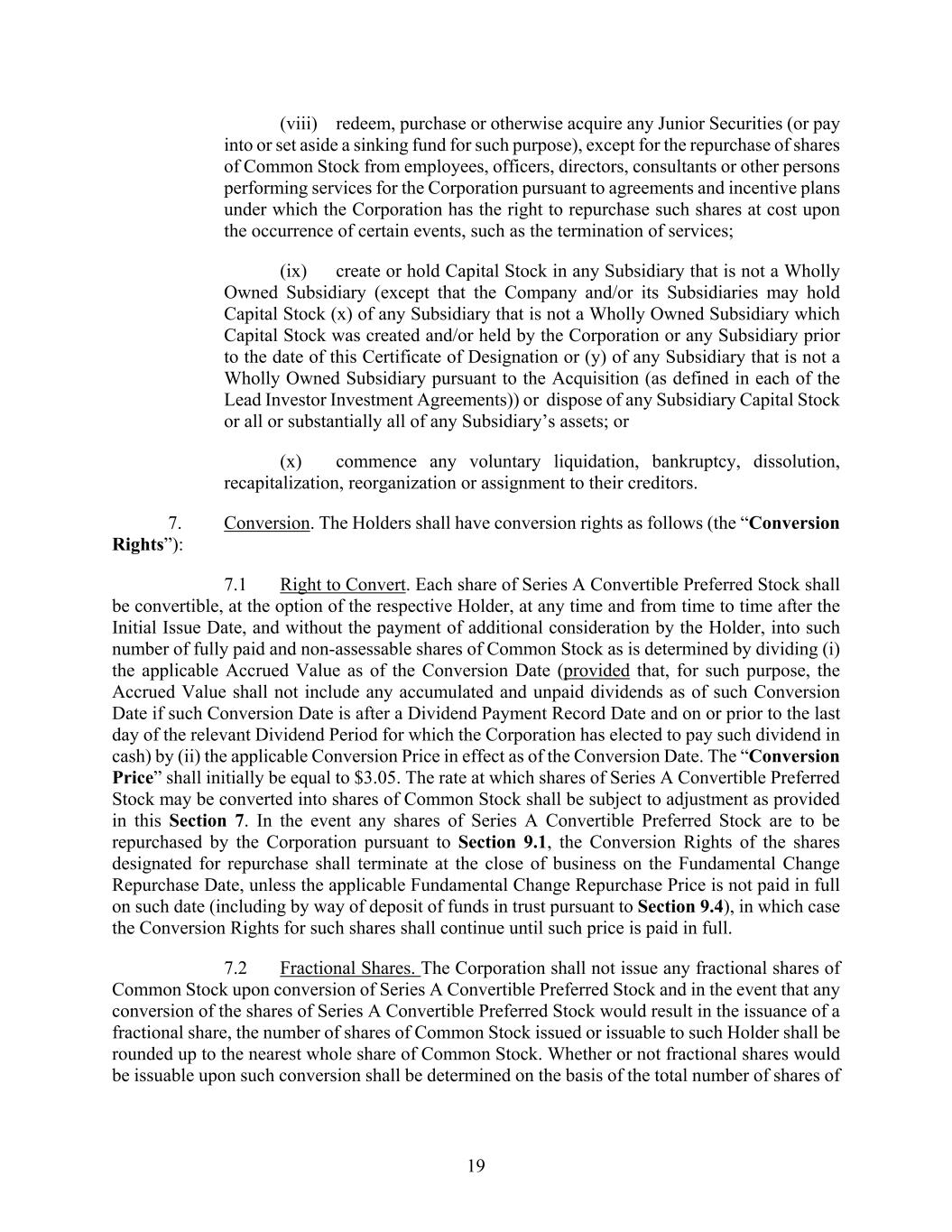 19 (viii) redeem, purchase or otherwise acquire any Junior Securities (or pay into or set aside a sinking fund for such purpose), except for the repurchase of shares of Common Stock from employees, officers, directors, consultants or other persons performing services for the Corporation pursuant to agreements and incentive plans under which the Corporation has the right to repurchase such shares at cost upon the occurrence of certain events, such as the termination of services; (ix) create or hold Capital Stock in any Subsidiary that is not a Wholly Owned Subsidiary (except that the Company and/or its Subsidiaries may hold Capital Stock (x) of any Subsidiary that is not a Wholly Owned Subsidiary which Capital Stock was created and/or held by the Corporation or any Subsidiary prior to the date of this Certificate of Designation or (y) of any Subsidiary that is not a Wholly Owned Subsidiary pursuant to the Acquisition (as defined in each of the Lead Investor Investment Agreements)) or dispose of any Subsidiary Capital Stock or all or substantially all of any Subsidiary’s assets; or (x) commence any voluntary liquidation, bankruptcy, dissolution, recapitalization, reorganization or assignment to their creditors. 7. Conversion. The Holders shall have conversion rights as follows (the “Conversion Rights”): 7.1 Right to Convert. Each share of Series A Convertible Preferred Stock shall be convertible, at the option of the respective Holder, at any time and from time to time after the Initial Issue Date, and without the payment of additional consideration by the Holder, into such number of fully paid and non-assessable shares of Common Stock as is determined by dividing (i) the applicable Accrued Value as of the Conversion Date (provided that, for such purpose, the Accrued Value shall not include any accumulated and unpaid dividends as of such Conversion Date if such Conversion Date is after a Dividend Payment Record Date and on or prior to the last day of the relevant Dividend Period for which the Corporation has elected to pay such dividend in cash) by (ii) the applicable Conversion Price in effect as of the Conversion Date. The “Conversion Price” shall initially be equal to $3.05. The rate at which shares of Series A Convertible Preferred Stock may be converted into shares of Common Stock shall be subject to adjustment as provided in this Section 7. In the event any shares of Series A Convertible Preferred Stock are to be repurchased by the Corporation pursuant to Section 9.1, the Conversion Rights of the shares designated for repurchase shall terminate at the close of business on the Fundamental Change Repurchase Date, unless the applicable Fundamental Change Repurchase Price is not paid in full on such date (including by way of deposit of funds in trust pursuant to Section 9.4), in which case the Conversion Rights for such shares shall continue until such price is paid in full. 7.2 Fractional Shares. The Corporation shall not issue any fractional shares of Common Stock upon conversion of Series A Convertible Preferred Stock and in the event that any conversion of the shares of Series A Convertible Preferred Stock would result in the issuance of a fractional share, the number of shares of Common Stock issued or issuable to such Holder shall be rounded up to the nearest whole share of Common Stock. Whether or not fractional shares would be issuable upon such conversion shall be determined on the basis of the total number of shares of