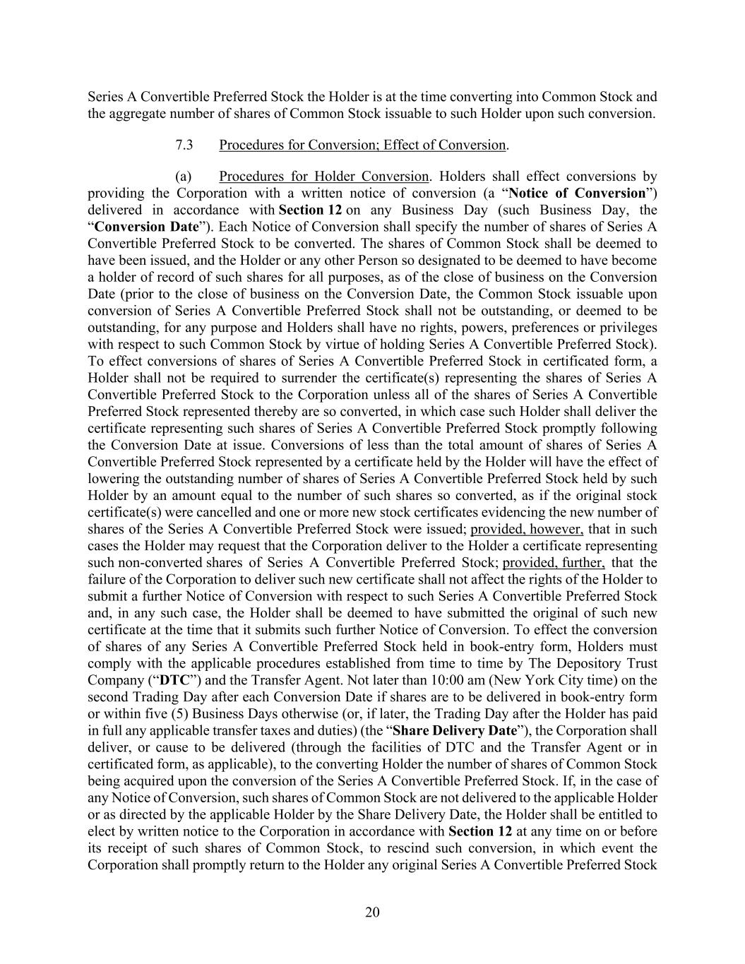 20 Series A Convertible Preferred Stock the Holder is at the time converting into Common Stock and the aggregate number of shares of Common Stock issuable to such Holder upon such conversion. 7.3 Procedures for Conversion; Effect of Conversion. (a) Procedures for Holder Conversion. Holders shall effect conversions by providing the Corporation with a written notice of conversion (a “Notice of Conversion”) delivered in accordance with Section 12 on any Business Day (such Business Day, the “Conversion Date”). Each Notice of Conversion shall specify the number of shares of Series A Convertible Preferred Stock to be converted. The shares of Common Stock shall be deemed to have been issued, and the Holder or any other Person so designated to be deemed to have become a holder of record of such shares for all purposes, as of the close of business on the Conversion Date (prior to the close of business on the Conversion Date, the Common Stock issuable upon conversion of Series A Convertible Preferred Stock shall not be outstanding, or deemed to be outstanding, for any purpose and Holders shall have no rights, powers, preferences or privileges with respect to such Common Stock by virtue of holding Series A Convertible Preferred Stock). To effect conversions of shares of Series A Convertible Preferred Stock in certificated form, a Holder shall not be required to surrender the certificate(s) representing the shares of Series A Convertible Preferred Stock to the Corporation unless all of the shares of Series A Convertible Preferred Stock represented thereby are so converted, in which case such Holder shall deliver the certificate representing such shares of Series A Convertible Preferred Stock promptly following the Conversion Date at issue. Conversions of less than the total amount of shares of Series A Convertible Preferred Stock represented by a certificate held by the Holder will have the effect of lowering the outstanding number of shares of Series A Convertible Preferred Stock held by such Holder by an amount equal to the number of such shares so converted, as if the original stock certificate(s) were cancelled and one or more new stock certificates evidencing the new number of shares of the Series A Convertible Preferred Stock were issued; provided, however, that in such cases the Holder may request that the Corporation deliver to the Holder a certificate representing such non-converted shares of Series A Convertible Preferred Stock; provided, further, that the failure of the Corporation to deliver such new certificate shall not affect the rights of the Holder to submit a further Notice of Conversion with respect to such Series A Convertible Preferred Stock and, in any such case, the Holder shall be deemed to have submitted the original of such new certificate at the time that it submits such further Notice of Conversion. To effect the conversion of shares of any Series A Convertible Preferred Stock held in book-entry form, Holders must comply with the applicable procedures established from time to time by The Depository Trust Company (“DTC”) and the Transfer Agent. Not later than 10:00 am (New York City time) on the second Trading Day after each Conversion Date if shares are to be delivered in book-entry form or within five (5) Business Days otherwise (or, if later, the Trading Day after the Holder has paid in full any applicable transfer taxes and duties) (the “Share Delivery Date”), the Corporation shall deliver, or cause to be delivered (through the facilities of DTC and the Transfer Agent or in certificated form, as applicable), to the converting Holder the number of shares of Common Stock being acquired upon the conversion of the Series A Convertible Preferred Stock. If, in the case of any Notice of Conversion, such shares of Common Stock are not delivered to the applicable Holder or as directed by the applicable Holder by the Share Delivery Date, the Holder shall be entitled to elect by written notice to the Corporation in accordance with Section 12 at any time on or before its receipt of such shares of Common Stock, to rescind such conversion, in which event the Corporation shall promptly return to the Holder any original Series A Convertible Preferred Stock