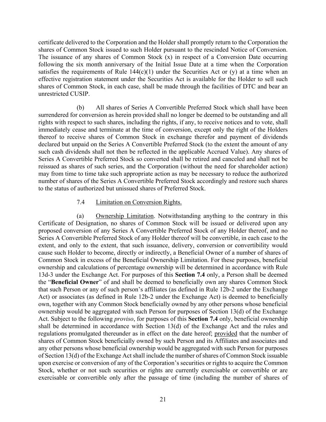 21 certificate delivered to the Corporation and the Holder shall promptly return to the Corporation the shares of Common Stock issued to such Holder pursuant to the rescinded Notice of Conversion. The issuance of any shares of Common Stock (x) in respect of a Conversion Date occurring following the six month anniversary of the Initial Issue Date at a time when the Corporation satisfies the requirements of Rule 144(c)(1) under the Securities Act or (y) at a time when an effective registration statement under the Securities Act is available for the Holder to sell such shares of Common Stock, in each case, shall be made through the facilities of DTC and bear an unrestricted CUSIP. (b) All shares of Series A Convertible Preferred Stock which shall have been surrendered for conversion as herein provided shall no longer be deemed to be outstanding and all rights with respect to such shares, including the rights, if any, to receive notices and to vote, shall immediately cease and terminate at the time of conversion, except only the right of the Holders thereof to receive shares of Common Stock in exchange therefor and payment of dividends declared but unpaid on the Series A Convertible Preferred Stock (to the extent the amount of any such cash dividends shall not then be reflected in the applicable Accrued Value). Any shares of Series A Convertible Preferred Stock so converted shall be retired and canceled and shall not be reissued as shares of such series, and the Corporation (without the need for shareholder action) may from time to time take such appropriate action as may be necessary to reduce the authorized number of shares of the Series A Convertible Preferred Stock accordingly and restore such shares to the status of authorized but unissued shares of Preferred Stock. 7.4 Limitation on Conversion Rights. (a) Ownership Limitation. Notwithstanding anything to the contrary in this Certificate of Designation, no shares of Common Stock will be issued or delivered upon any proposed conversion of any Series A Convertible Preferred Stock of any Holder thereof, and no Series A Convertible Preferred Stock of any Holder thereof will be convertible, in each case to the extent, and only to the extent, that such issuance, delivery, conversion or convertibility would cause such Holder to become, directly or indirectly, a Beneficial Owner of a number of shares of Common Stock in excess of the Beneficial Ownership Limitation. For these purposes, beneficial ownership and calculations of percentage ownership will be determined in accordance with Rule 13d-3 under the Exchange Act. For purposes of this Section 7.4 only, a Person shall be deemed the “Beneficial Owner” of and shall be deemed to beneficially own any shares Common Stock that such Person or any of such person’s affiliates (as defined in Rule 12b-2 under the Exchange Act) or associates (as defined in Rule 12b-2 under the Exchange Act) is deemed to beneficially own, together with any Common Stock beneficially owned by any other persons whose beneficial ownership would be aggregated with such Person for purposes of Section 13(d) of the Exchange Act. Subject to the following proviso, for purposes of this Section 7.4 only, beneficial ownership shall be determined in accordance with Section 13(d) of the Exchange Act and the rules and regulations promulgated thereunder as in effect on the date hereof; provided that the number of shares of Common Stock beneficially owned by such Person and its Affiliates and associates and any other persons whose beneficial ownership would be aggregated with such Person for purposes of Section 13(d) of the Exchange Act shall include the number of shares of Common Stock issuable upon exercise or conversion of any of the Corporation’s securities or rights to acquire the Common Stock, whether or not such securities or rights are currently exercisable or convertible or are exercisable or convertible only after the passage of time (including the number of shares of