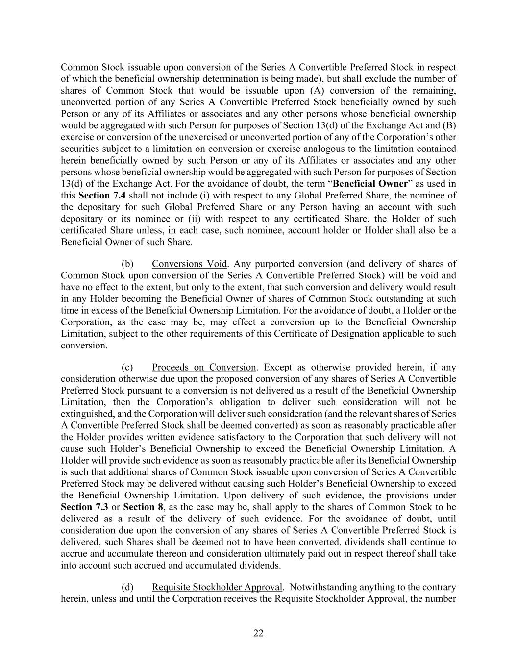22 Common Stock issuable upon conversion of the Series A Convertible Preferred Stock in respect of which the beneficial ownership determination is being made), but shall exclude the number of shares of Common Stock that would be issuable upon (A) conversion of the remaining, unconverted portion of any Series A Convertible Preferred Stock beneficially owned by such Person or any of its Affiliates or associates and any other persons whose beneficial ownership would be aggregated with such Person for purposes of Section 13(d) of the Exchange Act and (B) exercise or conversion of the unexercised or unconverted portion of any of the Corporation’s other securities subject to a limitation on conversion or exercise analogous to the limitation contained herein beneficially owned by such Person or any of its Affiliates or associates and any other persons whose beneficial ownership would be aggregated with such Person for purposes of Section 13(d) of the Exchange Act. For the avoidance of doubt, the term “Beneficial Owner” as used in this Section 7.4 shall not include (i) with respect to any Global Preferred Share, the nominee of the depositary for such Global Preferred Share or any Person having an account with such depositary or its nominee or (ii) with respect to any certificated Share, the Holder of such certificated Share unless, in each case, such nominee, account holder or Holder shall also be a Beneficial Owner of such Share. (b) Conversions Void. Any purported conversion (and delivery of shares of Common Stock upon conversion of the Series A Convertible Preferred Stock) will be void and have no effect to the extent, but only to the extent, that such conversion and delivery would result in any Holder becoming the Beneficial Owner of shares of Common Stock outstanding at such time in excess of the Beneficial Ownership Limitation. For the avoidance of doubt, a Holder or the Corporation, as the case may be, may effect a conversion up to the Beneficial Ownership Limitation, subject to the other requirements of this Certificate of Designation applicable to such conversion. (c) Proceeds on Conversion. Except as otherwise provided herein, if any consideration otherwise due upon the proposed conversion of any shares of Series A Convertible Preferred Stock pursuant to a conversion is not delivered as a result of the Beneficial Ownership Limitation, then the Corporation’s obligation to deliver such consideration will not be extinguished, and the Corporation will deliver such consideration (and the relevant shares of Series A Convertible Preferred Stock shall be deemed converted) as soon as reasonably practicable after the Holder provides written evidence satisfactory to the Corporation that such delivery will not cause such Holder’s Beneficial Ownership to exceed the Beneficial Ownership Limitation. A Holder will provide such evidence as soon as reasonably practicable after its Beneficial Ownership is such that additional shares of Common Stock issuable upon conversion of Series A Convertible Preferred Stock may be delivered without causing such Holder’s Beneficial Ownership to exceed the Beneficial Ownership Limitation. Upon delivery of such evidence, the provisions under Section 7.3 or Section 8, as the case may be, shall apply to the shares of Common Stock to be delivered as a result of the delivery of such evidence. For the avoidance of doubt, until consideration due upon the conversion of any shares of Series A Convertible Preferred Stock is delivered, such Shares shall be deemed not to have been converted, dividends shall continue to accrue and accumulate thereon and consideration ultimately paid out in respect thereof shall take into account such accrued and accumulated dividends. (d) Requisite Stockholder Approval. Notwithstanding anything to the contrary herein, unless and until the Corporation receives the Requisite Stockholder Approval, the number