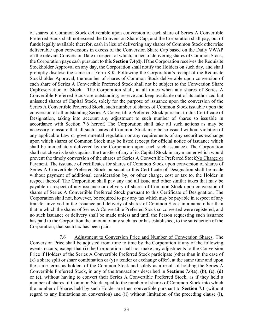 23 of shares of Common Stock deliverable upon conversion of each share of Series A Convertible Preferred Stock shall not exceed the Conversion Share Cap, and the Corporation shall pay, out of funds legally available therefor, cash in lieu of delivering any shares of Common Stock otherwise deliverable upon conversions in excess of the Conversion Share Cap based on the Daily VWAP on the relevant Conversion Date in respect of which, in lieu of delivering shares of Common Stock, the Corporation pays cash pursuant to this Section 7.4(d). If the Corporation receives the Requisite Stockholder Approval on any day, the Corporation shall notify the Holders on such day, and shall promptly disclose the same in a Form 8-K. Following the Corporation’s receipt of the Requisite Stockholder Approval, the number of shares of Common Stock deliverable upon conversion of each share of Series A Convertible Preferred Stock shall not be subject to the Conversion Share CapReservation of Stock. The Corporation shall, at all times when any shares of Series A Convertible Preferred Stock are outstanding, reserve and keep available out of its authorized but unissued shares of Capital Stock, solely for the purpose of issuance upon the conversion of the Series A Convertible Preferred Stock, such number of shares of Common Stock issuable upon the conversion of all outstanding Series A Convertible Preferred Stock pursuant to this Certificate of Designation, taking into account any adjustment to such number of shares so issuable in accordance with Section 7.6 hereof. The Corporation shall take all such actions as may be necessary to assure that all such shares of Common Stock may be so issued without violation of any applicable Law or governmental regulation or any requirements of any securities exchange upon which shares of Common Stock may be listed (except for official notice of issuance which shall be immediately delivered by the Corporation upon each such issuance). The Corporation shall not close its books against the transfer of any of its Capital Stock in any manner which would prevent the timely conversion of the shares of Series A Convertible Preferred StockNo Charge or Payment. The issuance of certificates for shares of Common Stock upon conversion of shares of Series A Convertible Preferred Stock pursuant to this Certificate of Designation shall be made without payment of additional consideration by, or other charge, cost or tax to, the Holder in respect thereof. The Corporation shall pay any and all issue and other similar taxes that may be payable in respect of any issuance or delivery of shares of Common Stock upon conversion of shares of Series A Convertible Preferred Stock pursuant to this Certificate of Designation. The Corporation shall not, however, be required to pay any tax which may be payable in respect of any transfer involved in the issuance and delivery of shares of Common Stock in a name other than that in which the shares of Series A Convertible Preferred Stock so converted were registered, and no such issuance or delivery shall be made unless and until the Person requesting such issuance has paid to the Corporation the amount of any such tax or has established, to the satisfaction of the Corporation, that such tax has been paid. 7.6 Adjustment to Conversion Price and Number of Conversion Shares. The Conversion Price shall be adjusted from time to time by the Corporation if any of the following events occurs, except that (i) the Corporation shall not make any adjustments to the Conversion Price if Holders of the Series A Convertible Preferred Stock participate (other than in the case of (x) a share split or share combination or (y) a tender or exchange offer), at the same time and upon the same terms as holders of the Common Stock and solely as a result of holding the Series A Convertible Preferred Stock, in any of the transactions described in Sections 7.6(a), (b), (c), (d) or (e), without having to convert their Series A Convertible Preferred Stock, as if they held a number of shares of Common Stock equal to the number of shares of Common Stock into which the number of Shares held by such Holder are then convertible pursuant to Section 7.1 (without regard to any limitations on conversion) and (ii) without limitation of the preceding clause (i),