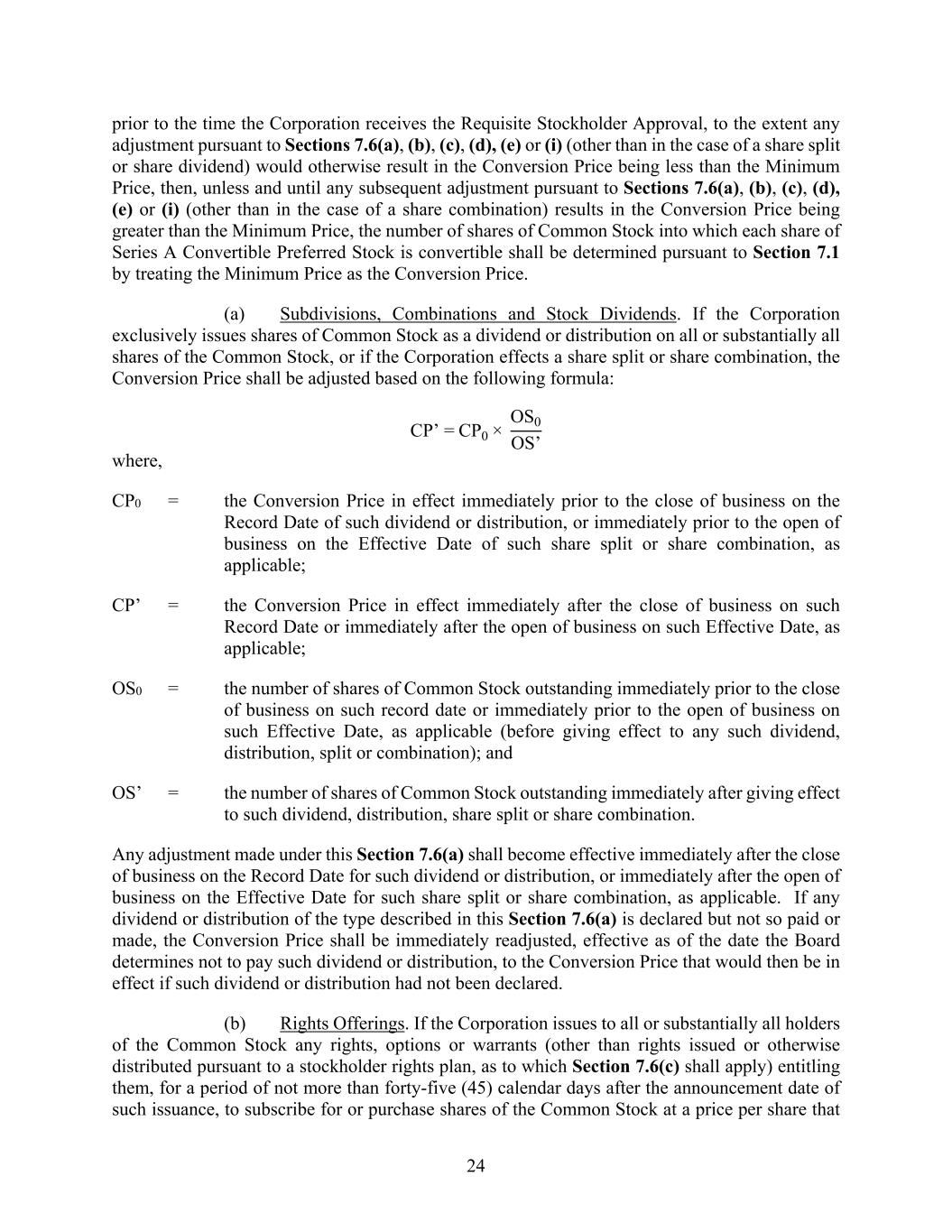 24 prior to the time the Corporation receives the Requisite Stockholder Approval, to the extent any adjustment pursuant to Sections 7.6(a), (b), (c), (d), (e) or (i) (other than in the case of a share split or share dividend) would otherwise result in the Conversion Price being less than the Minimum Price, then, unless and until any subsequent adjustment pursuant to Sections 7.6(a), (b), (c), (d), (e) or (i) (other than in the case of a share combination) results in the Conversion Price being greater than the Minimum Price, the number of shares of Common Stock into which each share of Series A Convertible Preferred Stock is convertible shall be determined pursuant to Section 7.1 by treating the Minimum Price as the Conversion Price. (a) Subdivisions, Combinations and Stock Dividends. If the Corporation exclusively issues shares of Common Stock as a dividend or distribution on all or substantially all shares of the Common Stock, or if the Corporation effects a share split or share combination, the Conversion Price shall be adjusted based on the following formula: CP’ = CP0 × OS0 OS’ where, CP0 = the Conversion Price in effect immediately prior to the close of business on the Record Date of such dividend or distribution, or immediately prior to the open of business on the Effective Date of such share split or share combination, as applicable; CP’ = the Conversion Price in effect immediately after the close of business on such Record Date or immediately after the open of business on such Effective Date, as applicable; OS0 = the number of shares of Common Stock outstanding immediately prior to the close of business on such record date or immediately prior to the open of business on such Effective Date, as applicable (before giving effect to any such dividend, distribution, split or combination); and OS’ = the number of shares of Common Stock outstanding immediately after giving effect to such dividend, distribution, share split or share combination. Any adjustment made under this Section 7.6(a) shall become effective immediately after the close of business on the Record Date for such dividend or distribution, or immediately after the open of business on the Effective Date for such share split or share combination, as applicable. If any dividend or distribution of the type described in this Section 7.6(a) is declared but not so paid or made, the Conversion Price shall be immediately readjusted, effective as of the date the Board determines not to pay such dividend or distribution, to the Conversion Price that would then be in effect if such dividend or distribution had not been declared. (b) Rights Offerings. If the Corporation issues to all or substantially all holders of the Common Stock any rights, options or warrants (other than rights issued or otherwise distributed pursuant to a stockholder rights plan, as to which Section 7.6(c) shall apply) entitling them, for a period of not more than forty-five (45) calendar days after the announcement date of such issuance, to subscribe for or purchase shares of the Common Stock at a price per share that