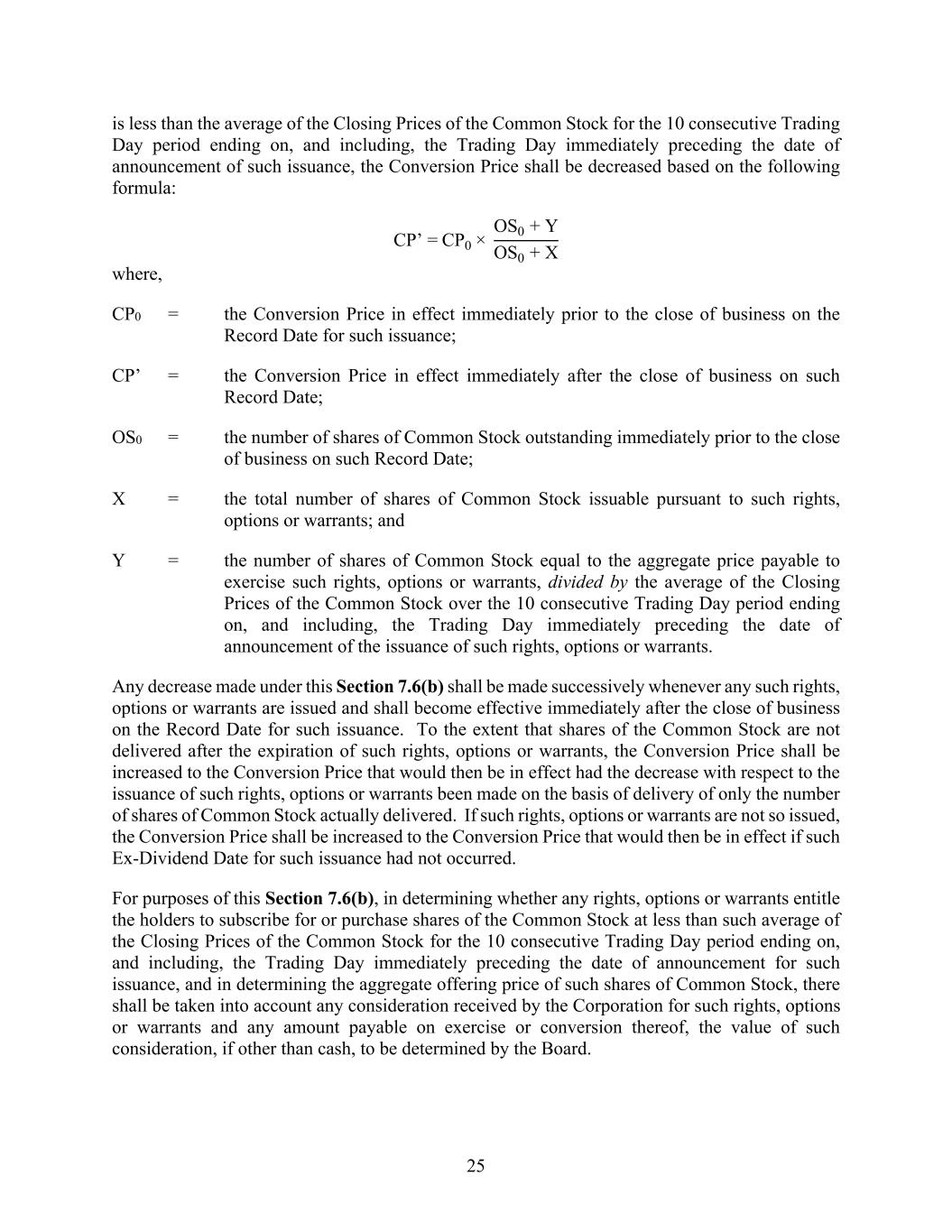25 is less than the average of the Closing Prices of the Common Stock for the 10 consecutive Trading Day period ending on, and including, the Trading Day immediately preceding the date of announcement of such issuance, the Conversion Price shall be decreased based on the following formula: CP’ = CP0 × OS0 + Y OS0 + X where, CP0 = the Conversion Price in effect immediately prior to the close of business on the Record Date for such issuance; CP’ = the Conversion Price in effect immediately after the close of business on such Record Date; OS0 = the number of shares of Common Stock outstanding immediately prior to the close of business on such Record Date; X = the total number of shares of Common Stock issuable pursuant to such rights, options or warrants; and Y = the number of shares of Common Stock equal to the aggregate price payable to exercise such rights, options or warrants, divided by the average of the Closing Prices of the Common Stock over the 10 consecutive Trading Day period ending on, and including, the Trading Day immediately preceding the date of announcement of the issuance of such rights, options or warrants. Any decrease made under this Section 7.6(b) shall be made successively whenever any such rights, options or warrants are issued and shall become effective immediately after the close of business on the Record Date for such issuance. To the extent that shares of the Common Stock are not delivered after the expiration of such rights, options or warrants, the Conversion Price shall be increased to the Conversion Price that would then be in effect had the decrease with respect to the issuance of such rights, options or warrants been made on the basis of delivery of only the number of shares of Common Stock actually delivered. If such rights, options or warrants are not so issued, the Conversion Price shall be increased to the Conversion Price that would then be in effect if such Ex-Dividend Date for such issuance had not occurred. For purposes of this Section 7.6(b), in determining whether any rights, options or warrants entitle the holders to subscribe for or purchase shares of the Common Stock at less than such average of the Closing Prices of the Common Stock for the 10 consecutive Trading Day period ending on, and including, the Trading Day immediately preceding the date of announcement for such issuance, and in determining the aggregate offering price of such shares of Common Stock, there shall be taken into account any consideration received by the Corporation for such rights, options or warrants and any amount payable on exercise or conversion thereof, the value of such consideration, if other than cash, to be determined by the Board.
