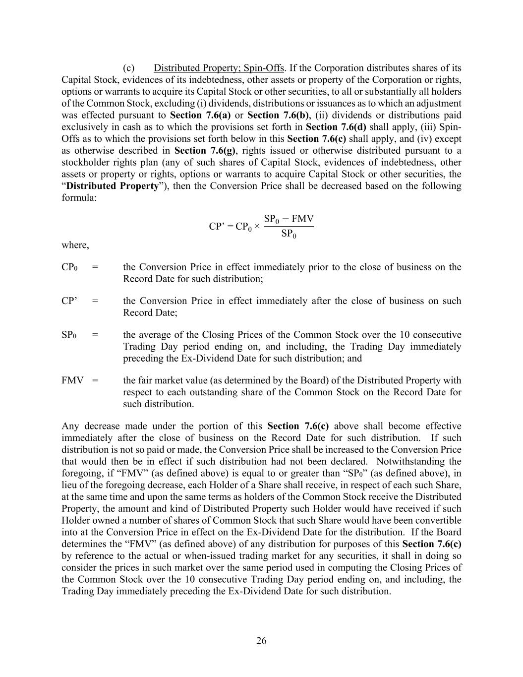 26 (c) Distributed Property; Spin-Offs. If the Corporation distributes shares of its Capital Stock, evidences of its indebtedness, other assets or property of the Corporation or rights, options or warrants to acquire its Capital Stock or other securities, to all or substantially all holders of the Common Stock, excluding (i) dividends, distributions or issuances as to which an adjustment was effected pursuant to Section 7.6(a) or Section 7.6(b), (ii) dividends or distributions paid exclusively in cash as to which the provisions set forth in Section 7.6(d) shall apply, (iii) Spin- Offs as to which the provisions set forth below in this Section 7.6(c) shall apply, and (iv) except as otherwise described in Section 7.6(g), rights issued or otherwise distributed pursuant to a stockholder rights plan (any of such shares of Capital Stock, evidences of indebtedness, other assets or property or rights, options or warrants to acquire Capital Stock or other securities, the “Distributed Property”), then the Conversion Price shall be decreased based on the following formula: CP’ = CP0 × SP0 − FMV SP0 where, CP0 = the Conversion Price in effect immediately prior to the close of business on the Record Date for such distribution; CP’ = the Conversion Price in effect immediately after the close of business on such Record Date; SP0 = the average of the Closing Prices of the Common Stock over the 10 consecutive Trading Day period ending on, and including, the Trading Day immediately preceding the Ex-Dividend Date for such distribution; and FMV = the fair market value (as determined by the Board) of the Distributed Property with respect to each outstanding share of the Common Stock on the Record Date for such distribution. Any decrease made under the portion of this Section 7.6(c) above shall become effective immediately after the close of business on the Record Date for such distribution. If such distribution is not so paid or made, the Conversion Price shall be increased to the Conversion Price that would then be in effect if such distribution had not been declared. Notwithstanding the foregoing, if “FMV” (as defined above) is equal to or greater than “SP0” (as defined above), in lieu of the foregoing decrease, each Holder of a Share shall receive, in respect of each such Share, at the same time and upon the same terms as holders of the Common Stock receive the Distributed Property, the amount and kind of Distributed Property such Holder would have received if such Holder owned a number of shares of Common Stock that such Share would have been convertible into at the Conversion Price in effect on the Ex-Dividend Date for the distribution. If the Board determines the “FMV” (as defined above) of any distribution for purposes of this Section 7.6(c) by reference to the actual or when-issued trading market for any securities, it shall in doing so consider the prices in such market over the same period used in computing the Closing Prices of the Common Stock over the 10 consecutive Trading Day period ending on, and including, the Trading Day immediately preceding the Ex-Dividend Date for such distribution.