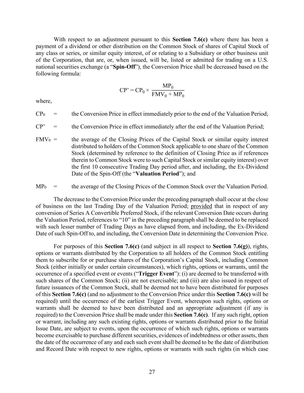 27 With respect to an adjustment pursuant to this Section 7.6(c) where there has been a payment of a dividend or other distribution on the Common Stock of shares of Capital Stock of any class or series, or similar equity interest, of or relating to a Subsidiary or other business unit of the Corporation, that are, or, when issued, will be, listed or admitted for trading on a U.S. national securities exchange (a “Spin-Off”), the Conversion Price shall be decreased based on the following formula: CP’ = CP0 × MP0 FMV0 + MP0 where, CP0 = the Conversion Price in effect immediately prior to the end of the Valuation Period; CP’ = the Conversion Price in effect immediately after the end of the Valuation Period; FMV0 = the average of the Closing Prices of the Capital Stock or similar equity interest distributed to holders of the Common Stock applicable to one share of the Common Stock (determined by reference to the definition of Closing Price as if references therein to Common Stock were to such Capital Stock or similar equity interest) over the first 10 consecutive Trading Day period after, and including, the Ex-Dividend Date of the Spin-Off (the “Valuation Period”); and MP0 = the average of the Closing Prices of the Common Stock over the Valuation Period. The decrease to the Conversion Price under the preceding paragraph shall occur at the close of business on the last Trading Day of the Valuation Period; provided that in respect of any conversion of Series A Convertible Preferred Stock, if the relevant Conversion Date occurs during the Valuation Period, references to “10” in the preceding paragraph shall be deemed to be replaced with such lesser number of Trading Days as have elapsed from, and including, the Ex-Dividend Date of such Spin-Off to, and including, the Conversion Date in determining the Conversion Price. For purposes of this Section 7.6(c) (and subject in all respect to Section 7.6(g)), rights, options or warrants distributed by the Corporation to all holders of the Common Stock entitling them to subscribe for or purchase shares of the Corporation’s Capital Stock, including Common Stock (either initially or under certain circumstances), which rights, options or warrants, until the occurrence of a specified event or events (“Trigger Event”): (i) are deemed to be transferred with such shares of the Common Stock; (ii) are not exercisable; and (iii) are also issued in respect of future issuances of the Common Stock, shall be deemed not to have been distributed for purposes of this Section 7.6(c) (and no adjustment to the Conversion Price under this Section 7.6(c) will be required) until the occurrence of the earliest Trigger Event, whereupon such rights, options or warrants shall be deemed to have been distributed and an appropriate adjustment (if any is required) to the Conversion Price shall be made under this Section 7.6(c). If any such right, option or warrant, including any such existing rights, options or warrants distributed prior to the Initial Issue Date, are subject to events, upon the occurrence of which such rights, options or warrants become exercisable to purchase different securities, evidences of indebtedness or other assets, then the date of the occurrence of any and each such event shall be deemed to be the date of distribution and Record Date with respect to new rights, options or warrants with such rights (in which case