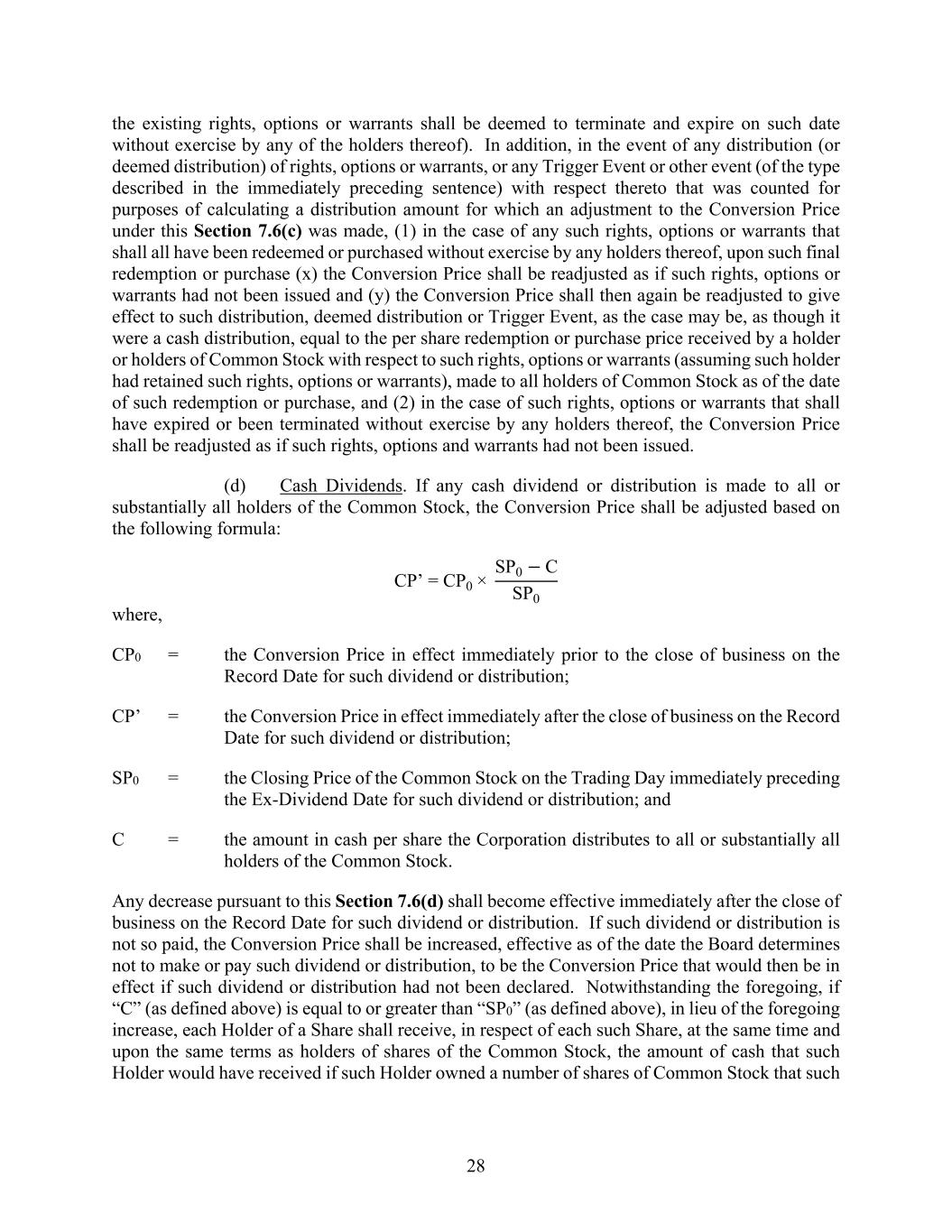 28 the existing rights, options or warrants shall be deemed to terminate and expire on such date without exercise by any of the holders thereof). In addition, in the event of any distribution (or deemed distribution) of rights, options or warrants, or any Trigger Event or other event (of the type described in the immediately preceding sentence) with respect thereto that was counted for purposes of calculating a distribution amount for which an adjustment to the Conversion Price under this Section 7.6(c) was made, (1) in the case of any such rights, options or warrants that shall all have been redeemed or purchased without exercise by any holders thereof, upon such final redemption or purchase (x) the Conversion Price shall be readjusted as if such rights, options or warrants had not been issued and (y) the Conversion Price shall then again be readjusted to give effect to such distribution, deemed distribution or Trigger Event, as the case may be, as though it were a cash distribution, equal to the per share redemption or purchase price received by a holder or holders of Common Stock with respect to such rights, options or warrants (assuming such holder had retained such rights, options or warrants), made to all holders of Common Stock as of the date of such redemption or purchase, and (2) in the case of such rights, options or warrants that shall have expired or been terminated without exercise by any holders thereof, the Conversion Price shall be readjusted as if such rights, options and warrants had not been issued. (d) Cash Dividends. If any cash dividend or distribution is made to all or substantially all holders of the Common Stock, the Conversion Price shall be adjusted based on the following formula: CP’ = CP0 × SP0 − C SP0 where, CP0 = the Conversion Price in effect immediately prior to the close of business on the Record Date for such dividend or distribution; CP’ = the Conversion Price in effect immediately after the close of business on the Record Date for such dividend or distribution; SP0 = the Closing Price of the Common Stock on the Trading Day immediately preceding the Ex-Dividend Date for such dividend or distribution; and C = the amount in cash per share the Corporation distributes to all or substantially all holders of the Common Stock. Any decrease pursuant to this Section 7.6(d) shall become effective immediately after the close of business on the Record Date for such dividend or distribution. If such dividend or distribution is not so paid, the Conversion Price shall be increased, effective as of the date the Board determines not to make or pay such dividend or distribution, to be the Conversion Price that would then be in effect if such dividend or distribution had not been declared. Notwithstanding the foregoing, if “C” (as defined above) is equal to or greater than “SP0” (as defined above), in lieu of the foregoing increase, each Holder of a Share shall receive, in respect of each such Share, at the same time and upon the same terms as holders of shares of the Common Stock, the amount of cash that such Holder would have received if such Holder owned a number of shares of Common Stock that such