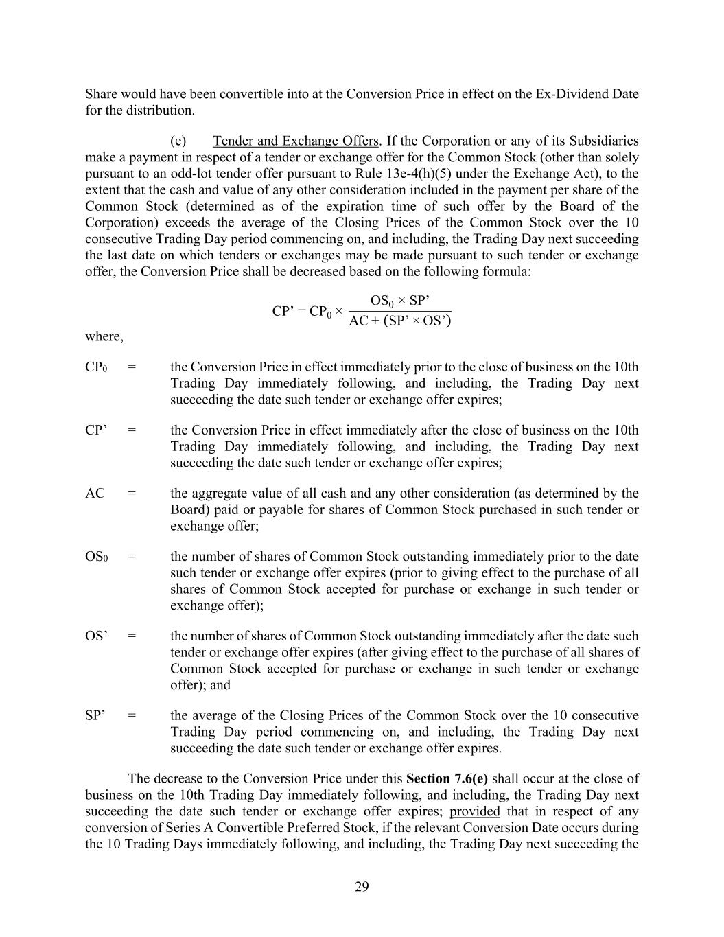 29 Share would have been convertible into at the Conversion Price in effect on the Ex-Dividend Date for the distribution. (e) Tender and Exchange Offers. If the Corporation or any of its Subsidiaries make a payment in respect of a tender or exchange offer for the Common Stock (other than solely pursuant to an odd-lot tender offer pursuant to Rule 13e-4(h)(5) under the Exchange Act), to the extent that the cash and value of any other consideration included in the payment per share of the Common Stock (determined as of the expiration time of such offer by the Board of the Corporation) exceeds the average of the Closing Prices of the Common Stock over the 10 consecutive Trading Day period commencing on, and including, the Trading Day next succeeding the last date on which tenders or exchanges may be made pursuant to such tender or exchange offer, the Conversion Price shall be decreased based on the following formula: CP’ = CP0 × OS0 × SP’ AC + SP’ × OS’ where, CP0 = the Conversion Price in effect immediately prior to the close of business on the 10th Trading Day immediately following, and including, the Trading Day next succeeding the date such tender or exchange offer expires; CP’ = the Conversion Price in effect immediately after the close of business on the 10th Trading Day immediately following, and including, the Trading Day next succeeding the date such tender or exchange offer expires; AC = the aggregate value of all cash and any other consideration (as determined by the Board) paid or payable for shares of Common Stock purchased in such tender or exchange offer; OS0 = the number of shares of Common Stock outstanding immediately prior to the date such tender or exchange offer expires (prior to giving effect to the purchase of all shares of Common Stock accepted for purchase or exchange in such tender or exchange offer); OS’ = the number of shares of Common Stock outstanding immediately after the date such tender or exchange offer expires (after giving effect to the purchase of all shares of Common Stock accepted for purchase or exchange in such tender or exchange offer); and SP’ = the average of the Closing Prices of the Common Stock over the 10 consecutive Trading Day period commencing on, and including, the Trading Day next succeeding the date such tender or exchange offer expires. The decrease to the Conversion Price under this Section 7.6(e) shall occur at the close of business on the 10th Trading Day immediately following, and including, the Trading Day next succeeding the date such tender or exchange offer expires; provided that in respect of any conversion of Series A Convertible Preferred Stock, if the relevant Conversion Date occurs during the 10 Trading Days immediately following, and including, the Trading Day next succeeding the