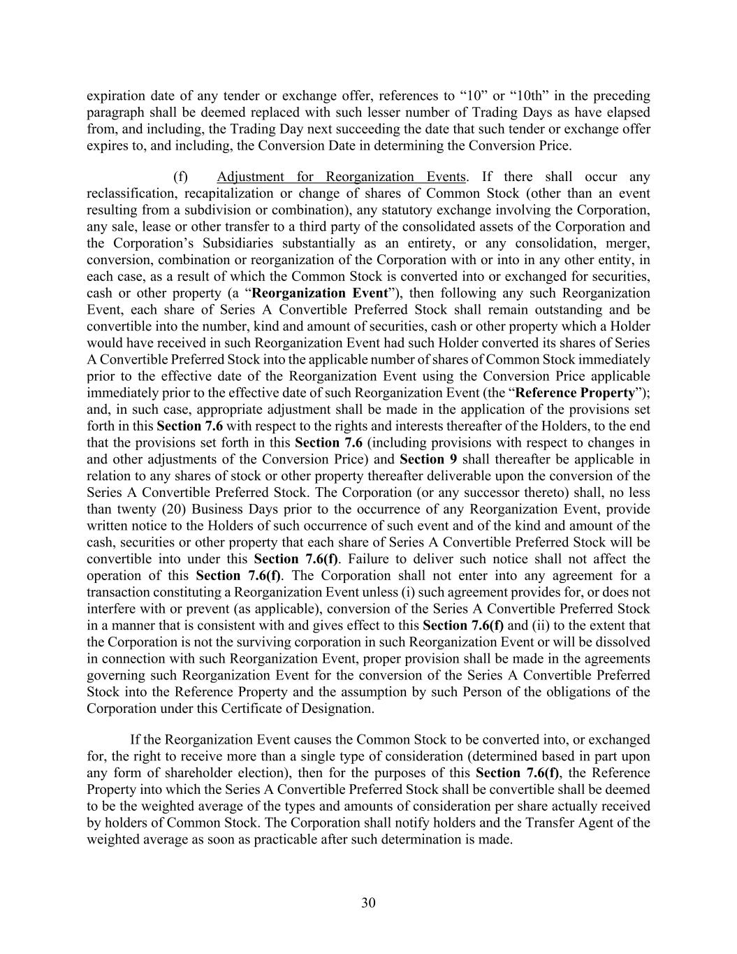 30 expiration date of any tender or exchange offer, references to “10” or “10th” in the preceding paragraph shall be deemed replaced with such lesser number of Trading Days as have elapsed from, and including, the Trading Day next succeeding the date that such tender or exchange offer expires to, and including, the Conversion Date in determining the Conversion Price. (f) Adjustment for Reorganization Events. If there shall occur any reclassification, recapitalization or change of shares of Common Stock (other than an event resulting from a subdivision or combination), any statutory exchange involving the Corporation, any sale, lease or other transfer to a third party of the consolidated assets of the Corporation and the Corporation’s Subsidiaries substantially as an entirety, or any consolidation, merger, conversion, combination or reorganization of the Corporation with or into in any other entity, in each case, as a result of which the Common Stock is converted into or exchanged for securities, cash or other property (a “Reorganization Event”), then following any such Reorganization Event, each share of Series A Convertible Preferred Stock shall remain outstanding and be convertible into the number, kind and amount of securities, cash or other property which a Holder would have received in such Reorganization Event had such Holder converted its shares of Series A Convertible Preferred Stock into the applicable number of shares of Common Stock immediately prior to the effective date of the Reorganization Event using the Conversion Price applicable immediately prior to the effective date of such Reorganization Event (the “Reference Property”); and, in such case, appropriate adjustment shall be made in the application of the provisions set forth in this Section 7.6 with respect to the rights and interests thereafter of the Holders, to the end that the provisions set forth in this Section 7.6 (including provisions with respect to changes in and other adjustments of the Conversion Price) and Section 9 shall thereafter be applicable in relation to any shares of stock or other property thereafter deliverable upon the conversion of the Series A Convertible Preferred Stock. The Corporation (or any successor thereto) shall, no less than twenty (20) Business Days prior to the occurrence of any Reorganization Event, provide written notice to the Holders of such occurrence of such event and of the kind and amount of the cash, securities or other property that each share of Series A Convertible Preferred Stock will be convertible into under this Section 7.6(f). Failure to deliver such notice shall not affect the operation of this Section 7.6(f). The Corporation shall not enter into any agreement for a transaction constituting a Reorganization Event unless (i) such agreement provides for, or does not interfere with or prevent (as applicable), conversion of the Series A Convertible Preferred Stock in a manner that is consistent with and gives effect to this Section 7.6(f) and (ii) to the extent that the Corporation is not the surviving corporation in such Reorganization Event or will be dissolved in connection with such Reorganization Event, proper provision shall be made in the agreements governing such Reorganization Event for the conversion of the Series A Convertible Preferred Stock into the Reference Property and the assumption by such Person of the obligations of the Corporation under this Certificate of Designation. If the Reorganization Event causes the Common Stock to be converted into, or exchanged for, the right to receive more than a single type of consideration (determined based in part upon any form of shareholder election), then for the purposes of this Section 7.6(f), the Reference Property into which the Series A Convertible Preferred Stock shall be convertible shall be deemed to be the weighted average of the types and amounts of consideration per share actually received by holders of Common Stock. The Corporation shall notify holders and the Transfer Agent of the weighted average as soon as practicable after such determination is made.