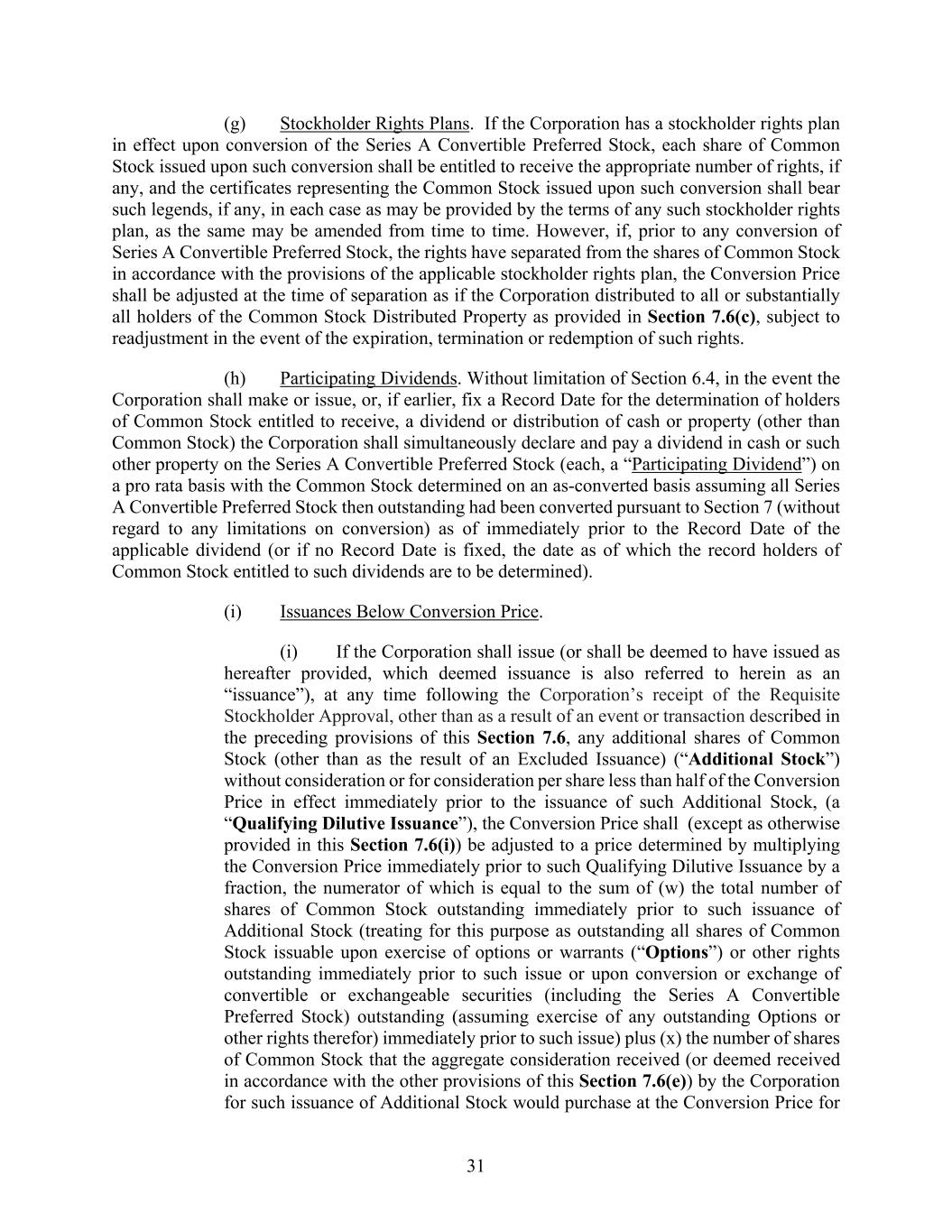31 (g) Stockholder Rights Plans. If the Corporation has a stockholder rights plan in effect upon conversion of the Series A Convertible Preferred Stock, each share of Common Stock issued upon such conversion shall be entitled to receive the appropriate number of rights, if any, and the certificates representing the Common Stock issued upon such conversion shall bear such legends, if any, in each case as may be provided by the terms of any such stockholder rights plan, as the same may be amended from time to time. However, if, prior to any conversion of Series A Convertible Preferred Stock, the rights have separated from the shares of Common Stock in accordance with the provisions of the applicable stockholder rights plan, the Conversion Price shall be adjusted at the time of separation as if the Corporation distributed to all or substantially all holders of the Common Stock Distributed Property as provided in Section 7.6(c), subject to readjustment in the event of the expiration, termination or redemption of such rights. (h) Participating Dividends. Without limitation of Section 6.4, in the event the Corporation shall make or issue, or, if earlier, fix a Record Date for the determination of holders of Common Stock entitled to receive, a dividend or distribution of cash or property (other than Common Stock) the Corporation shall simultaneously declare and pay a dividend in cash or such other property on the Series A Convertible Preferred Stock (each, a “Participating Dividend”) on a pro rata basis with the Common Stock determined on an as-converted basis assuming all Series A Convertible Preferred Stock then outstanding had been converted pursuant to Section 7 (without regard to any limitations on conversion) as of immediately prior to the Record Date of the applicable dividend (or if no Record Date is fixed, the date as of which the record holders of Common Stock entitled to such dividends are to be determined). (i) Issuances Below Conversion Price. (i) If the Corporation shall issue (or shall be deemed to have issued as hereafter provided, which deemed issuance is also referred to herein as an “issuance”), at any time following the Corporation’s receipt of the Requisite Stockholder Approval, other than as a result of an event or transaction described in the preceding provisions of this Section 7.6, any additional shares of Common Stock (other than as the result of an Excluded Issuance) (“Additional Stock”) without consideration or for consideration per share less than half of the Conversion Price in effect immediately prior to the issuance of such Additional Stock, (a “Qualifying Dilutive Issuance”), the Conversion Price shall (except as otherwise provided in this Section 7.6(i)) be adjusted to a price determined by multiplying the Conversion Price immediately prior to such Qualifying Dilutive Issuance by a fraction, the numerator of which is equal to the sum of (w) the total number of shares of Common Stock outstanding immediately prior to such issuance of Additional Stock (treating for this purpose as outstanding all shares of Common Stock issuable upon exercise of options or warrants (“Options”) or other rights outstanding immediately prior to such issue or upon conversion or exchange of convertible or exchangeable securities (including the Series A Convertible Preferred Stock) outstanding (assuming exercise of any outstanding Options or other rights therefor) immediately prior to such issue) plus (x) the number of shares of Common Stock that the aggregate consideration received (or deemed received in accordance with the other provisions of this Section 7.6(e)) by the Corporation for such issuance of Additional Stock would purchase at the Conversion Price for