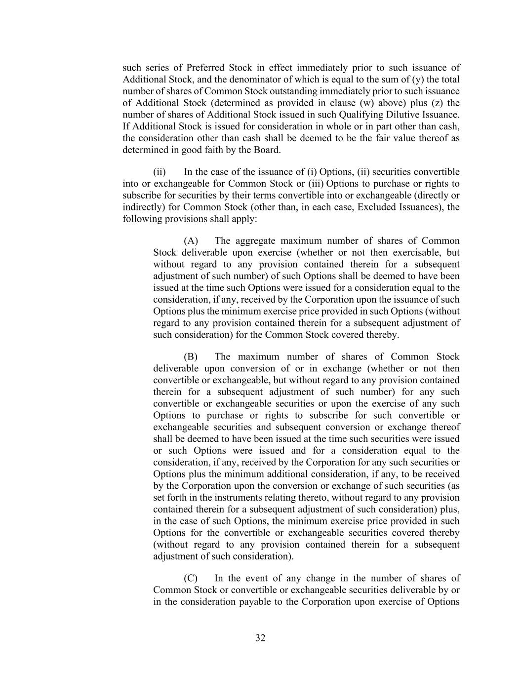 32 such series of Preferred Stock in effect immediately prior to such issuance of Additional Stock, and the denominator of which is equal to the sum of (y) the total number of shares of Common Stock outstanding immediately prior to such issuance of Additional Stock (determined as provided in clause (w) above) plus (z) the number of shares of Additional Stock issued in such Qualifying Dilutive Issuance. If Additional Stock is issued for consideration in whole or in part other than cash, the consideration other than cash shall be deemed to be the fair value thereof as determined in good faith by the Board. (ii) In the case of the issuance of (i) Options, (ii) securities convertible into or exchangeable for Common Stock or (iii) Options to purchase or rights to subscribe for securities by their terms convertible into or exchangeable (directly or indirectly) for Common Stock (other than, in each case, Excluded Issuances), the following provisions shall apply: (A) The aggregate maximum number of shares of Common Stock deliverable upon exercise (whether or not then exercisable, but without regard to any provision contained therein for a subsequent adjustment of such number) of such Options shall be deemed to have been issued at the time such Options were issued for a consideration equal to the consideration, if any, received by the Corporation upon the issuance of such Options plus the minimum exercise price provided in such Options (without regard to any provision contained therein for a subsequent adjustment of such consideration) for the Common Stock covered thereby. (B) The maximum number of shares of Common Stock deliverable upon conversion of or in exchange (whether or not then convertible or exchangeable, but without regard to any provision contained therein for a subsequent adjustment of such number) for any such convertible or exchangeable securities or upon the exercise of any such Options to purchase or rights to subscribe for such convertible or exchangeable securities and subsequent conversion or exchange thereof shall be deemed to have been issued at the time such securities were issued or such Options were issued and for a consideration equal to the consideration, if any, received by the Corporation for any such securities or Options plus the minimum additional consideration, if any, to be received by the Corporation upon the conversion or exchange of such securities (as set forth in the instruments relating thereto, without regard to any provision contained therein for a subsequent adjustment of such consideration) plus, in the case of such Options, the minimum exercise price provided in such Options for the convertible or exchangeable securities covered thereby (without regard to any provision contained therein for a subsequent adjustment of such consideration). (C) In the event of any change in the number of shares of Common Stock or convertible or exchangeable securities deliverable by or in the consideration payable to the Corporation upon exercise of Options