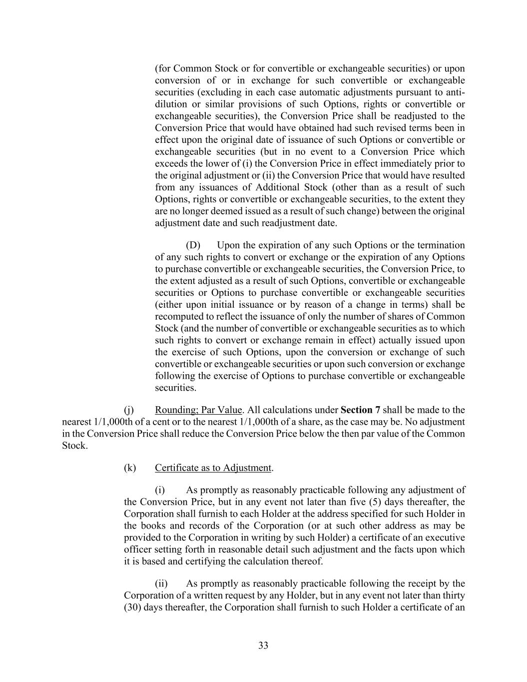 33 (for Common Stock or for convertible or exchangeable securities) or upon conversion of or in exchange for such convertible or exchangeable securities (excluding in each case automatic adjustments pursuant to anti- dilution or similar provisions of such Options, rights or convertible or exchangeable securities), the Conversion Price shall be readjusted to the Conversion Price that would have obtained had such revised terms been in effect upon the original date of issuance of such Options or convertible or exchangeable securities (but in no event to a Conversion Price which exceeds the lower of (i) the Conversion Price in effect immediately prior to the original adjustment or (ii) the Conversion Price that would have resulted from any issuances of Additional Stock (other than as a result of such Options, rights or convertible or exchangeable securities, to the extent they are no longer deemed issued as a result of such change) between the original adjustment date and such readjustment date. (D) Upon the expiration of any such Options or the termination of any such rights to convert or exchange or the expiration of any Options to purchase convertible or exchangeable securities, the Conversion Price, to the extent adjusted as a result of such Options, convertible or exchangeable securities or Options to purchase convertible or exchangeable securities (either upon initial issuance or by reason of a change in terms) shall be recomputed to reflect the issuance of only the number of shares of Common Stock (and the number of convertible or exchangeable securities as to which such rights to convert or exchange remain in effect) actually issued upon the exercise of such Options, upon the conversion or exchange of such convertible or exchangeable securities or upon such conversion or exchange following the exercise of Options to purchase convertible or exchangeable securities. (j) Rounding; Par Value. All calculations under Section 7 shall be made to the nearest 1/1,000th of a cent or to the nearest 1/1,000th of a share, as the case may be. No adjustment in the Conversion Price shall reduce the Conversion Price below the then par value of the Common Stock. (k) Certificate as to Adjustment. (i) As promptly as reasonably practicable following any adjustment of the Conversion Price, but in any event not later than five (5) days thereafter, the Corporation shall furnish to each Holder at the address specified for such Holder in the books and records of the Corporation (or at such other address as may be provided to the Corporation in writing by such Holder) a certificate of an executive officer setting forth in reasonable detail such adjustment and the facts upon which it is based and certifying the calculation thereof. (ii) As promptly as reasonably practicable following the receipt by the Corporation of a written request by any Holder, but in any event not later than thirty (30) days thereafter, the Corporation shall furnish to such Holder a certificate of an