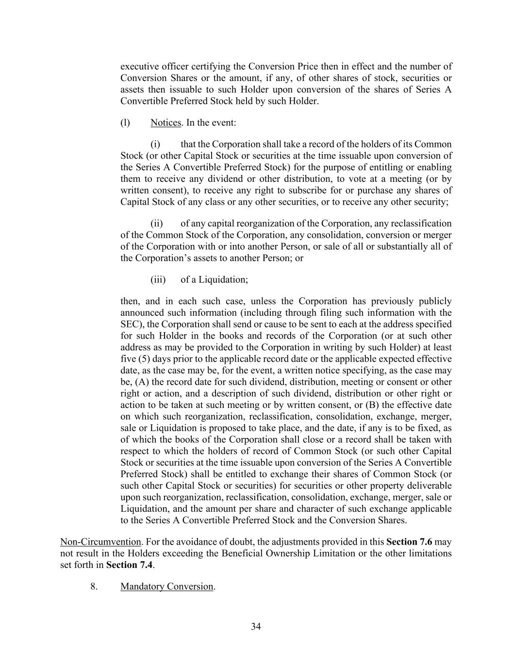 34 executive officer certifying the Conversion Price then in effect and the number of Conversion Shares or the amount, if any, of other shares of stock, securities or assets then issuable to such Holder upon conversion of the shares of Series A Convertible Preferred Stock held by such Holder. (l) Notices. In the event: (i) that the Corporation shall take a record of the holders of its Common Stock (or other Capital Stock or securities at the time issuable upon conversion of the Series A Convertible Preferred Stock) for the purpose of entitling or enabling them to receive any dividend or other distribution, to vote at a meeting (or by written consent), to receive any right to subscribe for or purchase any shares of Capital Stock of any class or any other securities, or to receive any other security; (ii) of any capital reorganization of the Corporation, any reclassification of the Common Stock of the Corporation, any consolidation, conversion or merger of the Corporation with or into another Person, or sale of all or substantially all of the Corporation’s assets to another Person; or (iii) of a Liquidation; then, and in each such case, unless the Corporation has previously publicly announced such information (including through filing such information with the SEC), the Corporation shall send or cause to be sent to each at the address specified for such Holder in the books and records of the Corporation (or at such other address as may be provided to the Corporation in writing by such Holder) at least five (5) days prior to the applicable record date or the applicable expected effective date, as the case may be, for the event, a written notice specifying, as the case may be, (A) the record date for such dividend, distribution, meeting or consent or other right or action, and a description of such dividend, distribution or other right or action to be taken at such meeting or by written consent, or (B) the effective date on which such reorganization, reclassification, consolidation, exchange, merger, sale or Liquidation is proposed to take place, and the date, if any is to be fixed, as of which the books of the Corporation shall close or a record shall be taken with respect to which the holders of record of Common Stock (or such other Capital Stock or securities at the time issuable upon conversion of the Series A Convertible Preferred Stock) shall be entitled to exchange their shares of Common Stock (or such other Capital Stock or securities) for securities or other property deliverable upon such reorganization, reclassification, consolidation, exchange, merger, sale or Liquidation, and the amount per share and character of such exchange applicable to the Series A Convertible Preferred Stock and the Conversion Shares. Non-Circumvention. For the avoidance of doubt, the adjustments provided in this Section 7.6 may not result in the Holders exceeding the Beneficial Ownership Limitation or the other limitations set forth in Section 7.4. 8. Mandatory Conversion.