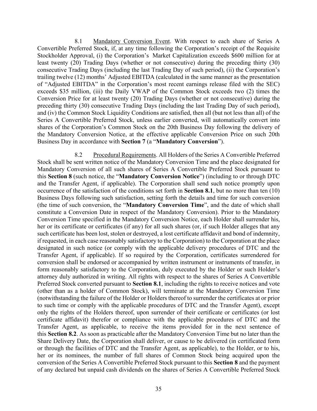 35 8.1 Mandatory Conversion Event. With respect to each share of Series A Convertible Preferred Stock, if, at any time following the Corporation’s receipt of the Requisite Stockholder Approval, (i) the Corporation’s Market Capitalization exceeds $600 million for at least twenty (20) Trading Days (whether or not consecutive) during the preceding thirty (30) consecutive Trading Days (including the last Trading Day of such period), (ii) the Corporation’s trailing twelve (12) months’ Adjusted EBITDA (calculated in the same manner as the presentation of “Adjusted EBITDA” in the Corporation’s most recent earnings release filed with the SEC) exceeds $35 million, (iii) the Daily VWAP of the Common Stock exceeds two (2) times the Conversion Price for at least twenty (20) Trading Days (whether or not consecutive) during the preceding thirty (30) consecutive Trading Days (including the last Trading Day of such period), and (iv) the Common Stock Liquidity Conditions are satisfied, then all (but not less than all) of the Series A Convertible Preferred Stock, unless earlier converted, will automatically convert into shares of the Corporation’s Common Stock on the 20th Business Day following the delivery of the Mandatory Conversion Notice, at the effective applicable Conversion Price on such 20th Business Day in accordance with Section 7 (a “Mandatory Conversion”). 8.2 Procedural Requirements. All Holders of the Series A Convertible Preferred Stock shall be sent written notice of the Mandatory Conversion Time and the place designated for Mandatory Conversion of all such shares of Series A Convertible Preferred Stock pursuant to this Section 8 (such notice, the “Mandatory Conversion Notice”) (including to or through DTC and the Transfer Agent, if applicable). The Corporation shall send such notice promptly upon occurrence of the satisfaction of the conditions set forth in Section 8.1, but no more than ten (10) Business Days following such satisfaction, setting forth the details and time for such conversion (the time of such conversion, the “Mandatory Conversion Time”, and the date of which shall constitute a Conversion Date in respect of the Mandatory Conversion). Prior to the Mandatory Conversion Time specified in the Mandatory Conversion Notice, each Holder shall surrender his, her or its certificate or certificates (if any) for all such shares (or, if such Holder alleges that any such certificate has been lost, stolen or destroyed, a lost certificate affidavit and bond of indemnity, if requested, in each case reasonably satisfactory to the Corporation) to the Corporation at the place designated in such notice (or comply with the applicable delivery procedures of DTC and the Transfer Agent, if applicable). If so required by the Corporation, certificates surrendered for conversion shall be endorsed or accompanied by written instrument or instruments of transfer, in form reasonably satisfactory to the Corporation, duly executed by the Holder or such Holder’s attorney duly authorized in writing. All rights with respect to the shares of Series A Convertible Preferred Stock converted pursuant to Section 8.1, including the rights to receive notices and vote (other than as a holder of Common Stock), will terminate at the Mandatory Conversion Time (notwithstanding the failure of the Holder or Holders thereof to surrender the certificates at or prior to such time or comply with the applicable procedures of DTC and the Transfer Agent), except only the rights of the Holders thereof, upon surrender of their certificate or certificates (or lost certificate affidavit) therefor or compliance with the applicable procedures of DTC and the Transfer Agent, as applicable, to receive the items provided for in the next sentence of this Section 8.2. As soon as practicable after the Mandatory Conversion Time but no later than the Share Delivery Date, the Corporation shall deliver, or cause to be delivered (in certificated form or through the facilities of DTC and the Transfer Agent, as applicable), to the Holder, or to his, her or its nominees, the number of full shares of Common Stock being acquired upon the conversion of the Series A Convertible Preferred Stock pursuant to this Section 8 and the payment of any declared but unpaid cash dividends on the shares of Series A Convertible Preferred Stock