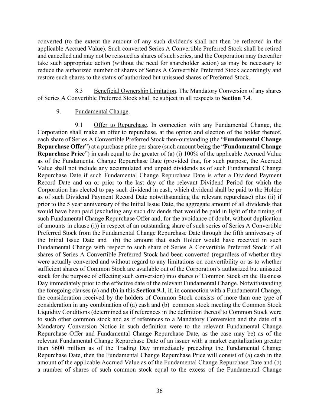 36 converted (to the extent the amount of any such dividends shall not then be reflected in the applicable Accrued Value). Such converted Series A Convertible Preferred Stock shall be retired and cancelled and may not be reissued as shares of such series, and the Corporation may thereafter take such appropriate action (without the need for shareholder action) as may be necessary to reduce the authorized number of shares of Series A Convertible Preferred Stock accordingly and restore such shares to the status of authorized but unissued shares of Preferred Stock. 8.3 Beneficial Ownership Limitation. The Mandatory Conversion of any shares of Series A Convertible Preferred Stock shall be subject in all respects to Section 7.4. 9. Fundamental Change. 9.1 Offer to Repurchase. In connection with any Fundamental Change, the Corporation shall make an offer to repurchase, at the option and election of the holder thereof, each share of Series A Convertible Preferred Stock then-outstanding (the “Fundamental Change Repurchase Offer”) at a purchase price per share (such amount being the “Fundamental Change Repurchase Price”) in cash equal to the greater of (a) (i) 100% of the applicable Accrued Value as of the Fundamental Change Repurchase Date (provided that, for such purpose, the Accrued Value shall not include any accumulated and unpaid dividends as of such Fundamental Change Repurchase Date if such Fundamental Change Repurchase Date is after a Dividend Payment Record Date and on or prior to the last day of the relevant Dividend Period for which the Corporation has elected to pay such dividend in cash, which dividend shall be paid to the Holder as of such Dividend Payment Record Date notwithstanding the relevant repurchase) plus (ii) if prior to the 5 year anniversary of the Initial Issue Date, the aggregate amount of all dividends that would have been paid (excluding any such dividends that would be paid in light of the timing of such Fundamental Change Repurchase Offer and, for the avoidance of doubt, without duplication of amounts in clause (i)) in respect of an outstanding share of such series of Series A Convertible Preferred Stock from the Fundamental Change Repurchase Date through the fifth anniversary of the Initial Issue Date and (b) the amount that such Holder would have received in such Fundamental Change with respect to such share of Series A Convertible Preferred Stock if all shares of Series A Convertible Preferred Stock had been converted (regardless of whether they were actually converted and without regard to any limitations on convertibility or as to whether sufficient shares of Common Stock are available out of the Corporation’s authorized but unissued stock for the purpose of effecting such conversion) into shares of Common Stock on the Business Day immediately prior to the effective date of the relevant Fundamental Change. Notwithstanding the foregoing clauses (a) and (b) in this Section 9.1, if, in connection with a Fundamental Change, the consideration received by the holders of Common Stock consists of more than one type of consideration in any combination of (a) cash and (b) common stock meeting the Common Stock Liquidity Conditions (determined as if references in the definition thereof to Common Stock were to such other common stock and as if references to a Mandatory Conversion and the date of a Mandatory Conversion Notice in such definition were to the relevant Fundamental Change Repurchase Offer and Fundamental Change Repurchase Date, as the case may be) as of the relevant Fundamental Change Repurchase Date of an issuer with a market capitalization greater than $600 million as of the Trading Day immediately preceding the Fundamental Change Repurchase Date, then the Fundamental Change Repurchase Price will consist of (a) cash in the amount of the applicable Accrued Value as of the Fundamental Change Repurchase Date and (b) a number of shares of such common stock equal to the excess of the Fundamental Change