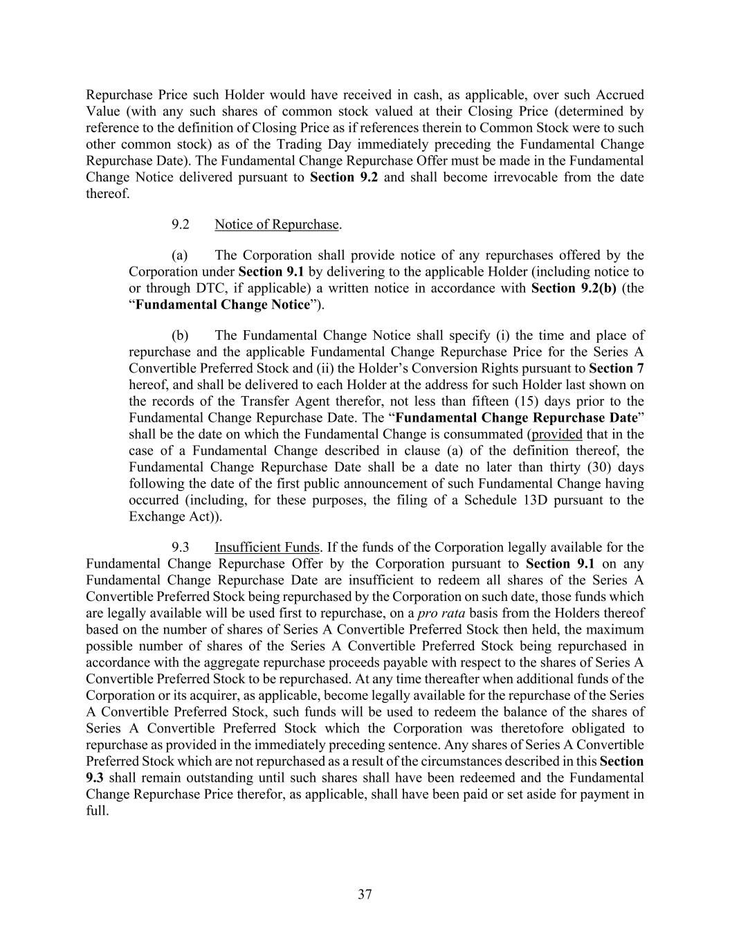 37 Repurchase Price such Holder would have received in cash, as applicable, over such Accrued Value (with any such shares of common stock valued at their Closing Price (determined by reference to the definition of Closing Price as if references therein to Common Stock were to such other common stock) as of the Trading Day immediately preceding the Fundamental Change Repurchase Date). The Fundamental Change Repurchase Offer must be made in the Fundamental Change Notice delivered pursuant to Section 9.2 and shall become irrevocable from the date thereof. 9.2 Notice of Repurchase. (a) The Corporation shall provide notice of any repurchases offered by the Corporation under Section 9.1 by delivering to the applicable Holder (including notice to or through DTC, if applicable) a written notice in accordance with Section 9.2(b) (the “Fundamental Change Notice”). (b) The Fundamental Change Notice shall specify (i) the time and place of repurchase and the applicable Fundamental Change Repurchase Price for the Series A Convertible Preferred Stock and (ii) the Holder’s Conversion Rights pursuant to Section 7 hereof, and shall be delivered to each Holder at the address for such Holder last shown on the records of the Transfer Agent therefor, not less than fifteen (15) days prior to the Fundamental Change Repurchase Date. The “Fundamental Change Repurchase Date” shall be the date on which the Fundamental Change is consummated (provided that in the case of a Fundamental Change described in clause (a) of the definition thereof, the Fundamental Change Repurchase Date shall be a date no later than thirty (30) days following the date of the first public announcement of such Fundamental Change having occurred (including, for these purposes, the filing of a Schedule 13D pursuant to the Exchange Act)). 9.3 Insufficient Funds. If the funds of the Corporation legally available for the Fundamental Change Repurchase Offer by the Corporation pursuant to Section 9.1 on any Fundamental Change Repurchase Date are insufficient to redeem all shares of the Series A Convertible Preferred Stock being repurchased by the Corporation on such date, those funds which are legally available will be used first to repurchase, on a pro rata basis from the Holders thereof based on the number of shares of Series A Convertible Preferred Stock then held, the maximum possible number of shares of the Series A Convertible Preferred Stock being repurchased in accordance with the aggregate repurchase proceeds payable with respect to the shares of Series A Convertible Preferred Stock to be repurchased. At any time thereafter when additional funds of the Corporation or its acquirer, as applicable, become legally available for the repurchase of the Series A Convertible Preferred Stock, such funds will be used to redeem the balance of the shares of Series A Convertible Preferred Stock which the Corporation was theretofore obligated to repurchase as provided in the immediately preceding sentence. Any shares of Series A Convertible Preferred Stock which are not repurchased as a result of the circumstances described in this Section 9.3 shall remain outstanding until such shares shall have been redeemed and the Fundamental Change Repurchase Price therefor, as applicable, shall have been paid or set aside for payment in full.