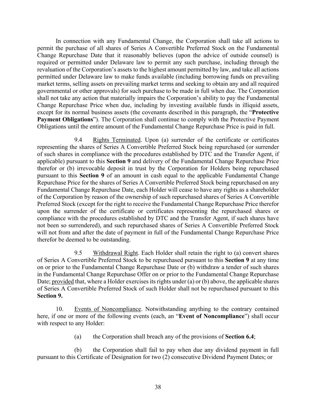38 In connection with any Fundamental Change, the Corporation shall take all actions to permit the purchase of all shares of Series A Convertible Preferred Stock on the Fundamental Change Repurchase Date that it reasonably believes (upon the advice of outside counsel) is required or permitted under Delaware law to permit any such purchase, including through the revaluation of the Corporation’s assets to the highest amount permitted by law, and take all actions permitted under Delaware law to make funds available (including borrowing funds on prevailing market terms, selling assets on prevailing market terms and seeking to obtain any and all required governmental or other approvals) for such purchase to be made in full when due. The Corporation shall not take any action that materially impairs the Corporation’s ability to pay the Fundamental Change Repurchase Price when due, including by investing available funds in illiquid assets, except for its normal business assets (the covenants described in this paragraph, the “Protective Payment Obligations”). The Corporation shall continue to comply with the Protective Payment Obligations until the entire amount of the Fundamental Change Repurchase Price is paid in full. 9.4 Rights Terminated. Upon (a) surrender of the certificate or certificates representing the shares of Series A Convertible Preferred Stock being repurchased (or surrender of such shares in compliance with the procedures established by DTC and the Transfer Agent, if applicable) pursuant to this Section 9 and delivery of the Fundamental Change Repurchase Price therefor or (b) irrevocable deposit in trust by the Corporation for Holders being repurchased pursuant to this Section 9 of an amount in cash equal to the applicable Fundamental Change Repurchase Price for the shares of Series A Convertible Preferred Stock being repurchased on any Fundamental Change Repurchase Date, each Holder will cease to have any rights as a shareholder of the Corporation by reason of the ownership of such repurchased shares of Series A Convertible Preferred Stock (except for the right to receive the Fundamental Change Repurchase Price therefor upon the surrender of the certificate or certificates representing the repurchased shares or compliance with the procedures established by DTC and the Transfer Agent, if such shares have not been so surrendered), and such repurchased shares of Series A Convertible Preferred Stock will not from and after the date of payment in full of the Fundamental Change Repurchase Price therefor be deemed to be outstanding. 9.5 Withdrawal Right. Each Holder shall retain the right to (a) convert shares of Series A Convertible Preferred Stock to be repurchased pursuant to this Section 9 at any time on or prior to the Fundamental Change Repurchase Date or (b) withdraw a tender of such shares in the Fundamental Change Repurchase Offer on or prior to the Fundamental Change Repurchase Date; provided that, where a Holder exercises its rights under (a) or (b) above, the applicable shares of Series A Convertible Preferred Stock of such Holder shall not be repurchased pursuant to this Section 9. 10. Events of Noncompliance. Notwithstanding anything to the contrary contained here, if one or more of the following events (each, an “Event of Noncompliance”) shall occur with respect to any Holder: (a) the Corporation shall breach any of the provisions of Section 6.4; (b) the Corporation shall fail to pay when due any dividend payment in full pursuant to this Certificate of Designation for two (2) consecutive Dividend Payment Dates; or