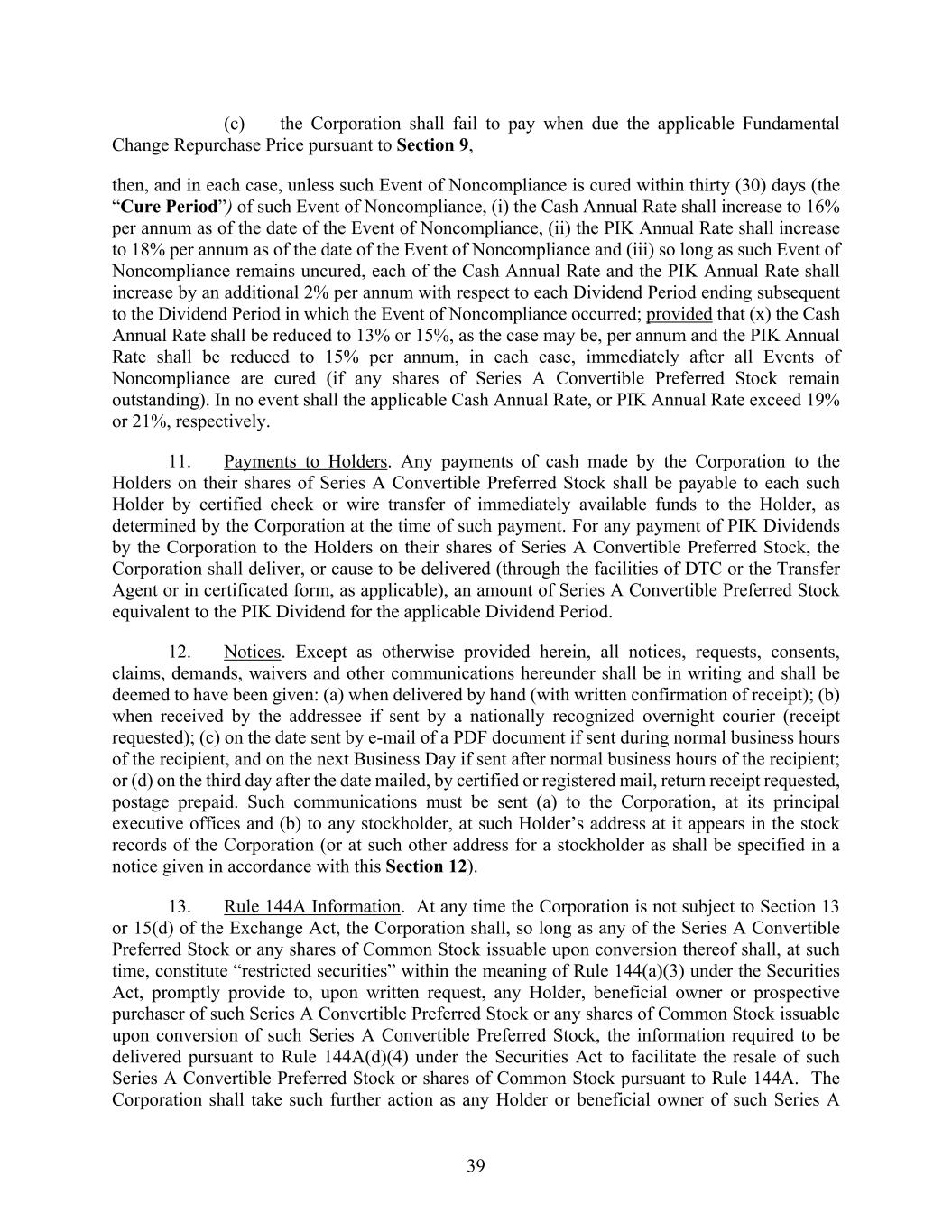 39 (c) the Corporation shall fail to pay when due the applicable Fundamental Change Repurchase Price pursuant to Section 9, then, and in each case, unless such Event of Noncompliance is cured within thirty (30) days (the “Cure Period”) of such Event of Noncompliance, (i) the Cash Annual Rate shall increase to 16% per annum as of the date of the Event of Noncompliance, (ii) the PIK Annual Rate shall increase to 18% per annum as of the date of the Event of Noncompliance and (iii) so long as such Event of Noncompliance remains uncured, each of the Cash Annual Rate and the PIK Annual Rate shall increase by an additional 2% per annum with respect to each Dividend Period ending subsequent to the Dividend Period in which the Event of Noncompliance occurred; provided that (x) the Cash Annual Rate shall be reduced to 13% or 15%, as the case may be, per annum and the PIK Annual Rate shall be reduced to 15% per annum, in each case, immediately after all Events of Noncompliance are cured (if any shares of Series A Convertible Preferred Stock remain outstanding). In no event shall the applicable Cash Annual Rate, or PIK Annual Rate exceed 19% or 21%, respectively. 11. Payments to Holders. Any payments of cash made by the Corporation to the Holders on their shares of Series A Convertible Preferred Stock shall be payable to each such Holder by certified check or wire transfer of immediately available funds to the Holder, as determined by the Corporation at the time of such payment. For any payment of PIK Dividends by the Corporation to the Holders on their shares of Series A Convertible Preferred Stock, the Corporation shall deliver, or cause to be delivered (through the facilities of DTC or the Transfer Agent or in certificated form, as applicable), an amount of Series A Convertible Preferred Stock equivalent to the PIK Dividend for the applicable Dividend Period. 12. Notices. Except as otherwise provided herein, all notices, requests, consents, claims, demands, waivers and other communications hereunder shall be in writing and shall be deemed to have been given: (a) when delivered by hand (with written confirmation of receipt); (b) when received by the addressee if sent by a nationally recognized overnight courier (receipt requested); (c) on the date sent by e-mail of a PDF document if sent during normal business hours of the recipient, and on the next Business Day if sent after normal business hours of the recipient; or (d) on the third day after the date mailed, by certified or registered mail, return receipt requested, postage prepaid. Such communications must be sent (a) to the Corporation, at its principal executive offices and (b) to any stockholder, at such Holder’s address at it appears in the stock records of the Corporation (or at such other address for a stockholder as shall be specified in a notice given in accordance with this Section 12). 13. Rule 144A Information. At any time the Corporation is not subject to Section 13 or 15(d) of the Exchange Act, the Corporation shall, so long as any of the Series A Convertible Preferred Stock or any shares of Common Stock issuable upon conversion thereof shall, at such time, constitute “restricted securities” within the meaning of Rule 144(a)(3) under the Securities Act, promptly provide to, upon written request, any Holder, beneficial owner or prospective purchaser of such Series A Convertible Preferred Stock or any shares of Common Stock issuable upon conversion of such Series A Convertible Preferred Stock, the information required to be delivered pursuant to Rule 144A(d)(4) under the Securities Act to facilitate the resale of such Series A Convertible Preferred Stock or shares of Common Stock pursuant to Rule 144A. The Corporation shall take such further action as any Holder or beneficial owner of such Series A