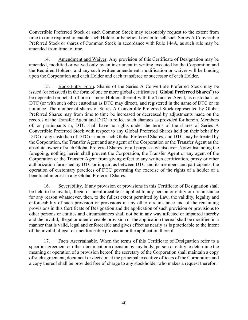 40 Convertible Preferred Stock or such Common Stock may reasonably request to the extent from time to time required to enable such Holder or beneficial owner to sell such Series A Convertible Preferred Stock or shares of Common Stock in accordance with Rule 144A, as such rule may be amended from time to time. 14. Amendment and Waiver. Any provision of this Certificate of Designation may be amended, modified or waived only by an instrument in writing executed by the Corporation and the Required Holders, and any such written amendment, modification or waiver will be binding upon the Corporation and each Holder and each transferee or successor of each Holder. 15. Book-Entry Form. Shares of the Series A Convertible Preferred Stock may be issued (or reissued) in the form of one or more global certificates (“Global Preferred Shares”) to be deposited on behalf of one or more Holders thereof with the Transfer Agent, as custodian for DTC (or with such other custodian as DTC may direct), and registered in the name of DTC or its nominee. The number of shares of Series A Convertible Preferred Stock represented by Global Preferred Shares may from time to time be increased or decreased by adjustments made on the records of the Transfer Agent and DTC to reflect such changes as provided for herein. Members of, or participants in, DTC shall have no rights under the terms of the shares of Series A Convertible Preferred Stock with respect to any Global Preferred Shares held on their behalf by DTC or any custodian of DTC or under such Global Preferred Shares, and DTC may be treated by the Corporation, the Transfer Agent and any agent of the Corporation or the Transfer Agent as the absolute owner of such Global Preferred Shares for all purposes whatsoever. Notwithstanding the foregoing, nothing herein shall prevent the Corporation, the Transfer Agent or any agent of the Corporation or the Transfer Agent from giving effect to any written certification, proxy or other authorization furnished by DTC or impair, as between DTC and its members and participants, the operation of customary practices of DTC governing the exercise of the rights of a holder of a beneficial interest in any Global Preferred Shares. 16. Severability. If any provision or provisions in this Certificate of Designation shall be held to be invalid, illegal or unenforceable as applied to any person or entity or circumstance for any reason whatsoever, then, to the fullest extent permitted by Law, the validity, legality and enforceability of such provision or provisions in any other circumstance and of the remaining provisions in this Certificate of Designation and the application of such provision or provisions to other persons or entities and circumstances shall not be in any way affected or impaired thereby and the invalid, illegal or unenforceable provision or the application thereof shall be modified in a manner that is valid, legal and enforceable and gives effect as nearly as is practicable to the intent of the invalid, illegal or unenforceable provision or the application thereof. 17. Facts Ascertainable. When the terms of this Certificate of Designation refer to a specific agreement or other document or a decision by any body, person or entity to determine the meaning or operation of a provision hereof, the secretary of the Corporation shall maintain a copy of such agreement, document or decision at the principal executive officers of the Corporation and a copy thereof shall be provided free of charge to any stockholder who makes a request therefor.