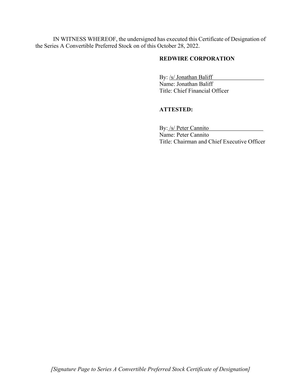 [Signature Page to Series A Convertible Preferred Stock Certificate of Designation] IN WITNESS WHEREOF, the undersigned has executed this Certificate of Designation of the Series A Convertible Preferred Stock on of this October 28, 2022. REDWIRE CORPORATION By: /s/ Jonathan Baliff . Name: Jonathan Baliff Title: Chief Financial Officer ATTESTED: By: /s/ Peter Cannito . Name: Peter Cannito Title: Chairman and Chief Executive Officer