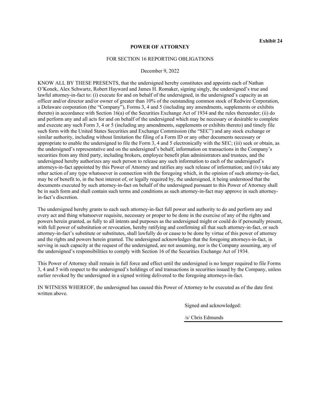 Exhibit 24 POWER OF ATTORNEY FOR SECTION 16 REPORTING OBLIGATIONS December 9, 2022 KNOW ALL BY THESE PRESENTS, that the undersigned hereby constitutes and appoints each of Nathan O’Konek, Alex Schwartz, Robert Hayward and James H. Romaker, signing singly, the undersigned’s true and lawful attorney-in-fact to: (i) execute for and on behalf of the undersigned, in the undersigned’s capacity as an officer and/or director and/or owner of greater than 10% of the outstanding common stock of Redwire Corporation, a Delaware corporation (the “Company”), Forms 3, 4 and 5 (including any amendments, supplements or exhibits thereto) in accordance with Section 16(a) of the Securities Exchange Act of 1934 and the rules thereunder; (ii) do and perform any and all acts for and on behalf of the undersigned which may be necessary or desirable to complete and execute any such Form 3, 4 or 5 (including any amendments, supplements or exhibits thereto) and timely file such form with the United States Securities and Exchange Commission (the “SEC”) and any stock exchange or similar authority, including without limitation the filing of a Form ID or any other documents necessary or appropriate to enable the undersigned to file the Form 3, 4 and 5 electronically with the SEC; (iii) seek or obtain, as the undersigned’s representative and on the undersigned’s behalf, information on transactions in the Company’s securities from any third party, including brokers, employee benefit plan administrators and trustees, and the undersigned hereby authorizes any such person to release any such information to each of the undersigned’s attorneys-in-fact appointed by this Power of Attorney and ratifies any such release of information; and (iv) take any other action of any type whatsoever in connection with the foregoing which, in the opinion of such attorney-in-fact, may be of benefit to, in the best interest of, or legally required by, the undersigned, it being understood that the documents executed by such attorney-in-fact on behalf of the undersigned pursuant to this Power of Attorney shall be in such form and shall contain such terms and conditions as such attorney-in-fact may approve in such attorney- in-fact’s discretion. The undersigned hereby grants to each such attorney-in-fact full power and authority to do and perform any and every act and thing whatsoever requisite, necessary or proper to be done in the exercise of any of the rights and powers herein granted, as fully to all intents and purposes as the undersigned might or could do if personally present, with full power of substitution or revocation, hereby ratifying and confirming all that such attorney-in-fact, or such attorney-in-fact’s substitute or substitutes, shall lawfully do or cause to be done by virtue of this power of attorney and the rights and powers herein granted. The undersigned acknowledges that the foregoing attorneys-in-fact, in serving in such capacity at the request of the undersigned, are not assuming, nor is the Company assuming, any of the undersigned’s responsibilities to comply with Section 16 of the Securities Exchange Act of 1934. This Power of Attorney shall remain in full force and effect until the undersigned is no longer required to file Forms 3, 4 and 5 with respect to the undersigned’s holdings of and transactions in securities issued by the Company, unless earlier revoked by the undersigned in a signed writing delivered to the foregoing attorneys-in-fact. IN WITNESS WHEREOF, the undersigned has caused this Power of Attorney to be executed as of the date first written above. Signed and acknowledged: /s/ Chris Edmunds