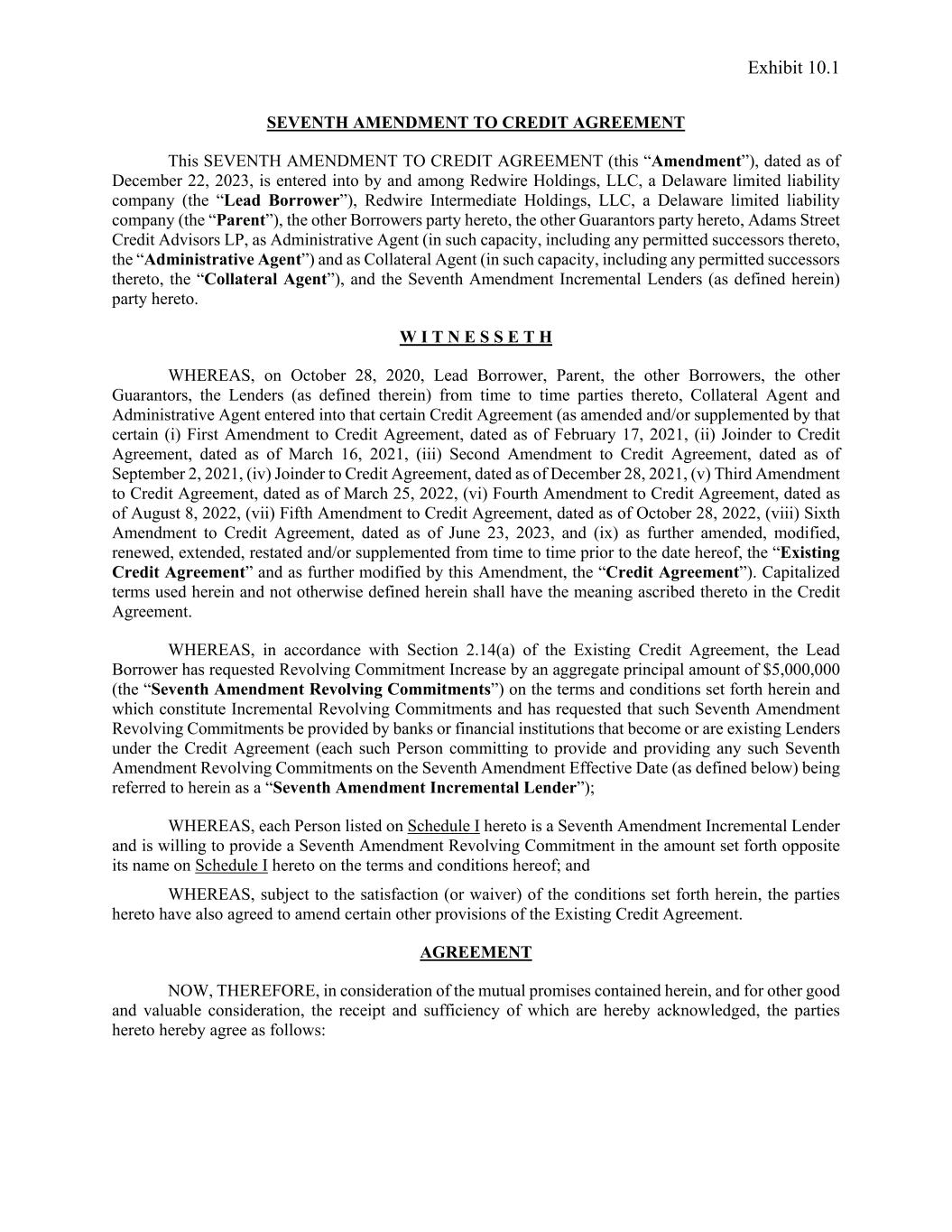 Exhibit 10.1 SEVENTH AMENDMENT TO CREDIT AGREEMENT This SEVENTH AMENDMENT TO CREDIT AGREEMENT (this “Amendment”), dated as of December 22, 2023, is entered into by and among Redwire Holdings, LLC, a Delaware limited liability company (the “Lead Borrower”), Redwire Intermediate Holdings, LLC, a Delaware limited liability company (the “Parent”), the other Borrowers party hereto, the other Guarantors party hereto, Adams Street Credit Advisors LP, as Administrative Agent (in such capacity, including any permitted successors thereto, the “Administrative Agent”) and as Collateral Agent (in such capacity, including any permitted successors thereto, the “Collateral Agent”), and the Seventh Amendment Incremental Lenders (as defined herein) party hereto. W I T N E S S E T H WHEREAS, on October 28, 2020, Lead Borrower, Parent, the other Borrowers, the other Guarantors, the Lenders (as defined therein) from time to time parties thereto, Collateral Agent and Administrative Agent entered into that certain Credit Agreement (as amended and/or supplemented by that certain (i) First Amendment to Credit Agreement, dated as of February 17, 2021, (ii) Joinder to Credit Agreement, dated as of March 16, 2021, (iii) Second Amendment to Credit Agreement, dated as of September 2, 2021, (iv) Joinder to Credit Agreement, dated as of December 28, 2021, (v) Third Amendment to Credit Agreement, dated as of March 25, 2022, (vi) Fourth Amendment to Credit Agreement, dated as of August 8, 2022, (vii) Fifth Amendment to Credit Agreement, dated as of October 28, 2022, (viii) Sixth Amendment to Credit Agreement, dated as of June 23, 2023, and (ix) as further amended, modified, renewed, extended, restated and/or supplemented from time to time prior to the date hereof, the “Existing Credit Agreement” and as further modified by this Amendment, the “Credit Agreement”). Capitalized terms used herein and not otherwise defined herein shall have the meaning ascribed thereto in the Credit Agreement. WHEREAS, in accordance with Section 2.14(a) of the Existing Credit Agreement, the Lead Borrower has requested Revolving Commitment Increase by an aggregate principal amount of $5,000,000 (the “Seventh Amendment Revolving Commitments”) on the terms and conditions set forth herein and which constitute Incremental Revolving Commitments and has requested that such Seventh Amendment Revolving Commitments be provided by banks or financial institutions that become or are existing Lenders under the Credit Agreement (each such Person committing to provide and providing any such Seventh Amendment Revolving Commitments on the Seventh Amendment Effective Date (as defined below) being referred to herein as a “Seventh Amendment Incremental Lender”); WHEREAS, each Person listed on Schedule I hereto is a Seventh Amendment Incremental Lender and is willing to provide a Seventh Amendment Revolving Commitment in the amount set forth opposite its name on Schedule I hereto on the terms and conditions hereof; and WHEREAS, subject to the satisfaction (or waiver) of the conditions set forth herein, the parties hereto have also agreed to amend certain other provisions of the Existing Credit Agreement. AGREEMENT NOW, THEREFORE, in consideration of the mutual promises contained herein, and for other good and valuable consideration, the receipt and sufficiency of which are hereby acknowledged, the parties hereto hereby agree as follows: