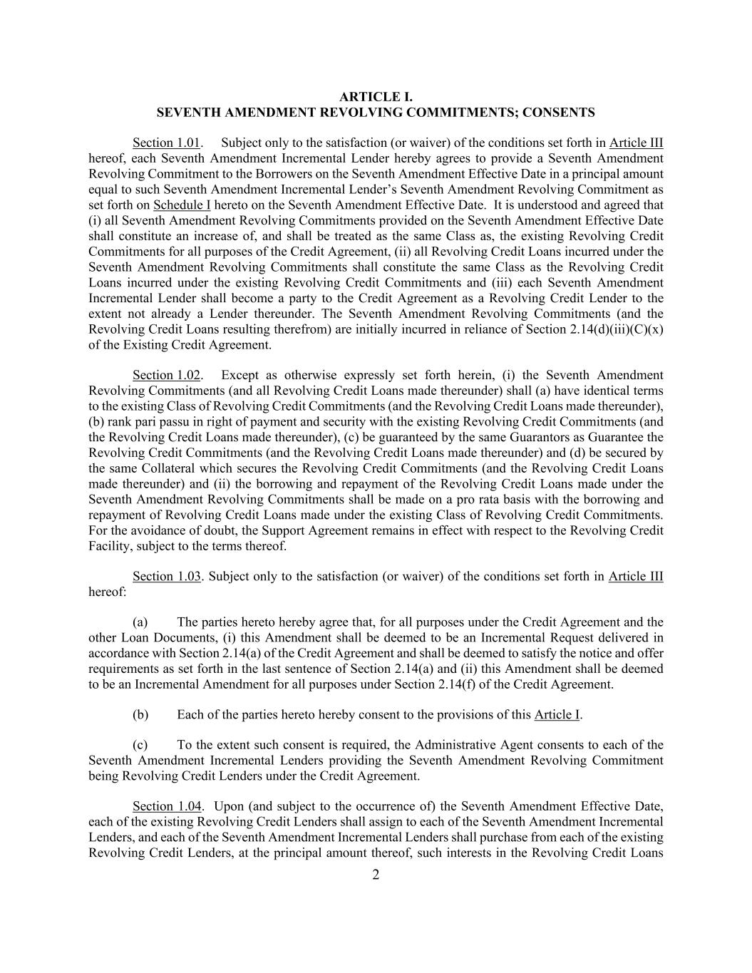 2 ARTICLE I. SEVENTH AMENDMENT REVOLVING COMMITMENTS; CONSENTS Section 1.01. Subject only to the satisfaction (or waiver) of the conditions set forth in Article III hereof, each Seventh Amendment Incremental Lender hereby agrees to provide a Seventh Amendment Revolving Commitment to the Borrowers on the Seventh Amendment Effective Date in a principal amount equal to such Seventh Amendment Incremental Lender’s Seventh Amendment Revolving Commitment as set forth on Schedule I hereto on the Seventh Amendment Effective Date. It is understood and agreed that (i) all Seventh Amendment Revolving Commitments provided on the Seventh Amendment Effective Date shall constitute an increase of, and shall be treated as the same Class as, the existing Revolving Credit Commitments for all purposes of the Credit Agreement, (ii) all Revolving Credit Loans incurred under the Seventh Amendment Revolving Commitments shall constitute the same Class as the Revolving Credit Loans incurred under the existing Revolving Credit Commitments and (iii) each Seventh Amendment Incremental Lender shall become a party to the Credit Agreement as a Revolving Credit Lender to the extent not already a Lender thereunder. The Seventh Amendment Revolving Commitments (and the Revolving Credit Loans resulting therefrom) are initially incurred in reliance of Section 2.14(d)(iii)(C)(x) of the Existing Credit Agreement. Section 1.02. Except as otherwise expressly set forth herein, (i) the Seventh Amendment Revolving Commitments (and all Revolving Credit Loans made thereunder) shall (a) have identical terms to the existing Class of Revolving Credit Commitments (and the Revolving Credit Loans made thereunder), (b) rank pari passu in right of payment and security with the existing Revolving Credit Commitments (and the Revolving Credit Loans made thereunder), (c) be guaranteed by the same Guarantors as Guarantee the Revolving Credit Commitments (and the Revolving Credit Loans made thereunder) and (d) be secured by the same Collateral which secures the Revolving Credit Commitments (and the Revolving Credit Loans made thereunder) and (ii) the borrowing and repayment of the Revolving Credit Loans made under the Seventh Amendment Revolving Commitments shall be made on a pro rata basis with the borrowing and repayment of Revolving Credit Loans made under the existing Class of Revolving Credit Commitments. For the avoidance of doubt, the Support Agreement remains in effect with respect to the Revolving Credit Facility, subject to the terms thereof. Section 1.03. Subject only to the satisfaction (or waiver) of the conditions set forth in Article III hereof: (a) The parties hereto hereby agree that, for all purposes under the Credit Agreement and the other Loan Documents, (i) this Amendment shall be deemed to be an Incremental Request delivered in accordance with Section 2.14(a) of the Credit Agreement and shall be deemed to satisfy the notice and offer requirements as set forth in the last sentence of Section 2.14(a) and (ii) this Amendment shall be deemed to be an Incremental Amendment for all purposes under Section 2.14(f) of the Credit Agreement. (b) Each of the parties hereto hereby consent to the provisions of this Article I. (c) To the extent such consent is required, the Administrative Agent consents to each of the Seventh Amendment Incremental Lenders providing the Seventh Amendment Revolving Commitment being Revolving Credit Lenders under the Credit Agreement. Section 1.04. Upon (and subject to the occurrence of) the Seventh Amendment Effective Date, each of the existing Revolving Credit Lenders shall assign to each of the Seventh Amendment Incremental Lenders, and each of the Seventh Amendment Incremental Lenders shall purchase from each of the existing Revolving Credit Lenders, at the principal amount thereof, such interests in the Revolving Credit Loans