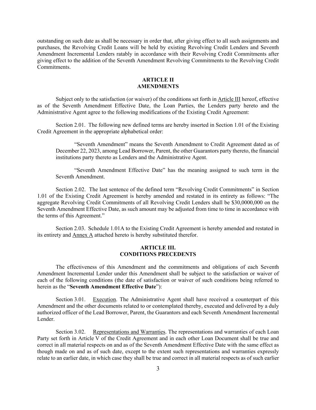 3 outstanding on such date as shall be necessary in order that, after giving effect to all such assignments and purchases, the Revolving Credit Loans will be held by existing Revolving Credit Lenders and Seventh Amendment Incremental Lenders ratably in accordance with their Revolving Credit Commitments after giving effect to the addition of the Seventh Amendment Revolving Commitments to the Revolving Credit Commitments. ARTICLE II AMENDMENTS Subject only to the satisfaction (or waiver) of the conditions set forth in Article III hereof, effective as of the Seventh Amendment Effective Date, the Loan Parties, the Lenders party hereto and the Administrative Agent agree to the following modifications of the Existing Credit Agreement: Section 2.01. The following new defined terms are hereby inserted in Section 1.01 of the Existing Credit Agreement in the appropriate alphabetical order: “Seventh Amendment” means the Seventh Amendment to Credit Agreement dated as of December 22, 2023, among Lead Borrower, Parent, the other Guarantors party thereto, the financial institutions party thereto as Lenders and the Administrative Agent. “Seventh Amendment Effective Date” has the meaning assigned to such term in the Seventh Amendment. Section 2.02. The last sentence of the defined term “Revolving Credit Commitments” in Section 1.01 of the Existing Credit Agreement is hereby amended and restated in its entirety as follows: “The aggregate Revolving Credit Commitments of all Revolving Credit Lenders shall be $30,0000,000 on the Seventh Amendment Effective Date, as such amount may be adjusted from time to time in accordance with the terms of this Agreement.” Section 2.03. Schedule 1.01A to the Existing Credit Agreement is hereby amended and restated in its entirety and Annex A attached hereto is hereby substituted therefor. ARTICLE III. CONDITIONS PRECEDENTS The effectiveness of this Amendment and the commitments and obligations of each Seventh Amendment Incremental Lender under this Amendment shall be subject to the satisfaction or waiver of each of the following conditions (the date of satisfaction or waiver of such conditions being referred to herein as the “Seventh Amendment Effective Date”): Section 3.01. Execution. The Administrative Agent shall have received a counterpart of this Amendment and the other documents related to or contemplated thereby, executed and delivered by a duly authorized officer of the Lead Borrower, Parent, the Guarantors and each Seventh Amendment Incremental Lender. Section 3.02. Representations and Warranties. The representations and warranties of each Loan Party set forth in Article V of the Credit Agreement and in each other Loan Document shall be true and correct in all material respects on and as of the Seventh Amendment Effective Date with the same effect as though made on and as of such date, except to the extent such representations and warranties expressly relate to an earlier date, in which case they shall be true and correct in all material respects as of such earlier