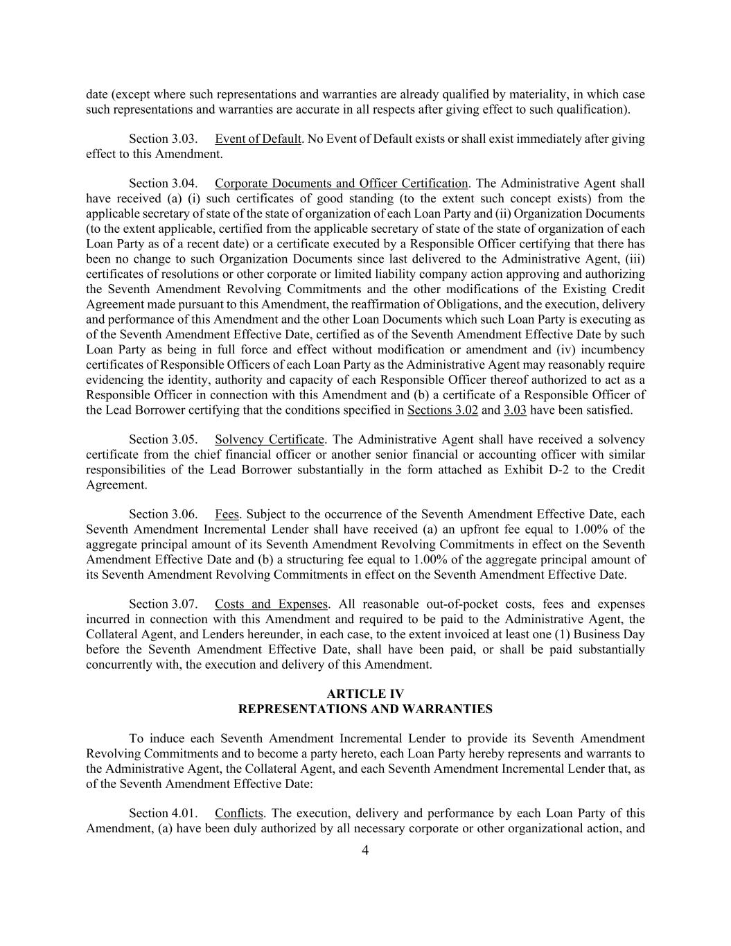 4 date (except where such representations and warranties are already qualified by materiality, in which case such representations and warranties are accurate in all respects after giving effect to such qualification). Section 3.03. Event of Default. No Event of Default exists or shall exist immediately after giving effect to this Amendment. Section 3.04. Corporate Documents and Officer Certification. The Administrative Agent shall have received (a) (i) such certificates of good standing (to the extent such concept exists) from the applicable secretary of state of the state of organization of each Loan Party and (ii) Organization Documents (to the extent applicable, certified from the applicable secretary of state of the state of organization of each Loan Party as of a recent date) or a certificate executed by a Responsible Officer certifying that there has been no change to such Organization Documents since last delivered to the Administrative Agent, (iii) certificates of resolutions or other corporate or limited liability company action approving and authorizing the Seventh Amendment Revolving Commitments and the other modifications of the Existing Credit Agreement made pursuant to this Amendment, the reaffirmation of Obligations, and the execution, delivery and performance of this Amendment and the other Loan Documents which such Loan Party is executing as of the Seventh Amendment Effective Date, certified as of the Seventh Amendment Effective Date by such Loan Party as being in full force and effect without modification or amendment and (iv) incumbency certificates of Responsible Officers of each Loan Party as the Administrative Agent may reasonably require evidencing the identity, authority and capacity of each Responsible Officer thereof authorized to act as a Responsible Officer in connection with this Amendment and (b) a certificate of a Responsible Officer of the Lead Borrower certifying that the conditions specified in Sections 3.02 and 3.03 have been satisfied. Section 3.05. Solvency Certificate. The Administrative Agent shall have received a solvency certificate from the chief financial officer or another senior financial or accounting officer with similar responsibilities of the Lead Borrower substantially in the form attached as Exhibit D-2 to the Credit Agreement. Section 3.06. Fees. Subject to the occurrence of the Seventh Amendment Effective Date, each Seventh Amendment Incremental Lender shall have received (a) an upfront fee equal to 1.00% of the aggregate principal amount of its Seventh Amendment Revolving Commitments in effect on the Seventh Amendment Effective Date and (b) a structuring fee equal to 1.00% of the aggregate principal amount of its Seventh Amendment Revolving Commitments in effect on the Seventh Amendment Effective Date. Section 3.07. Costs and Expenses. All reasonable out-of-pocket costs, fees and expenses incurred in connection with this Amendment and required to be paid to the Administrative Agent, the Collateral Agent, and Lenders hereunder, in each case, to the extent invoiced at least one (1) Business Day before the Seventh Amendment Effective Date, shall have been paid, or shall be paid substantially concurrently with, the execution and delivery of this Amendment. ARTICLE IV REPRESENTATIONS AND WARRANTIES To induce each Seventh Amendment Incremental Lender to provide its Seventh Amendment Revolving Commitments and to become a party hereto, each Loan Party hereby represents and warrants to the Administrative Agent, the Collateral Agent, and each Seventh Amendment Incremental Lender that, as of the Seventh Amendment Effective Date: Section 4.01. Conflicts. The execution, delivery and performance by each Loan Party of this Amendment, (a) have been duly authorized by all necessary corporate or other organizational action, and