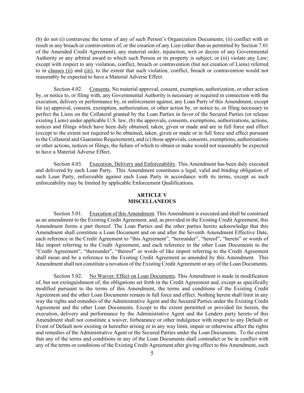 5 (b) do not (i) contravene the terms of any of such Person’s Organization Documents; (ii) conflict with or result in any breach or contravention of, or the creation of any Lien (other than as permitted by Section 7.01 of the Amended Credit Agreement), any material order, injunction, writ or decree of any Governmental Authority or any arbitral award to which such Person or its property is subject; or (iii) violate any Law; except with respect to any violation, conflict, breach or contravention (but not creation of Liens) referred to in clauses (ii) and (iii), to the extent that such violation, conflict, breach or contravention would not reasonably be expected to have a Material Adverse Effect. Section 4.02. Consents. No material approval, consent, exemption, authorization, or other action by, or notice to, or filing with, any Governmental Authority is necessary or required in connection with the execution, delivery or performance by, or enforcement against, any Loan Party of this Amendment, except for (a) approval, consent, exemption, authorization, or other action by, or notice to, or filing necessary to perfect the Liens on the Collateral granted by the Loan Parties in favor of the Secured Parties (or release existing Liens) under applicable U.S. law, (b) the approvals, consents, exemptions, authorizations, actions, notices and filings which have been duly obtained, taken, given or made and are in full force and effect (except to the extent not required to be obtained, taken, given or made or in full force and effect pursuant to the Collateral and Guarantee Requirement), and (c) those approvals, consents, exemptions, authorizations or other actions, notices or filings, the failure of which to obtain or make would not reasonably be expected to have a Material Adverse Effect. Section 4.03. Execution, Delivery and Enforceability. This Amendment has been duly executed and delivered by each Loan Party. This Amendment constitutes a legal, valid and binding obligation of such Loan Party, enforceable against each Loan Party in accordance with its terms, except as such enforceability may be limited by applicable Enforcement Qualifications. ARTICLE V MISCELLANEOUS Section 5.01. Execution of this Amendment. This Amendment is executed and shall be construed as an amendment to the Existing Credit Agreement, and, as provided in the Existing Credit Agreement, this Amendment forms a part thereof. The Loan Parties and the other parties hereto acknowledge that this Amendment shall constitute a Loan Document and on and after the Seventh Amendment Effective Date, each reference in the Credit Agreement to “this Agreement”, “hereunder”, “hereof”, “herein” or words of like import referring to the Credit Agreement, and each reference in the other Loan Documents to the “Credit Agreement”, “thereunder”, “thereof” or words of like import referring to the Credit Agreement shall mean and be a reference to the Existing Credit Agreement as amended by this Amendment. This Amendment shall not constitute a novation of the Existing Credit Agreement or any of the Loan Documents. Section 5.02. No Waiver; Effect on Loan Documents. This Amendment is made in modification of, but not extinguishment of, the obligations set forth in the Credit Agreement and, except as specifically modified pursuant to the terms of this Amendment, the terms and conditions of the Existing Credit Agreement and the other Loan Documents remain in full force and effect. Nothing herein shall limit in any way the rights and remedies of the Administrative Agent and the Secured Parties under the Existing Credit Agreement and the other Loan Documents. Except to the extent permitted or provided for herein, the execution, delivery and performance by the Administrative Agent and the Lenders party hereto of this Amendment shall not constitute a waiver, forbearance or other indulgence with respect to any Default or Event of Default now existing or hereafter arising or in any way limit, impair or otherwise affect the rights and remedies of the Administrative Agent or the Secured Parties under the Loan Documents. To the extent that any of the terms and conditions in any of the Loan Documents shall contradict or be in conflict with any of the terms or conditions of the Existing Credit Agreement after giving effect to this Amendment, such