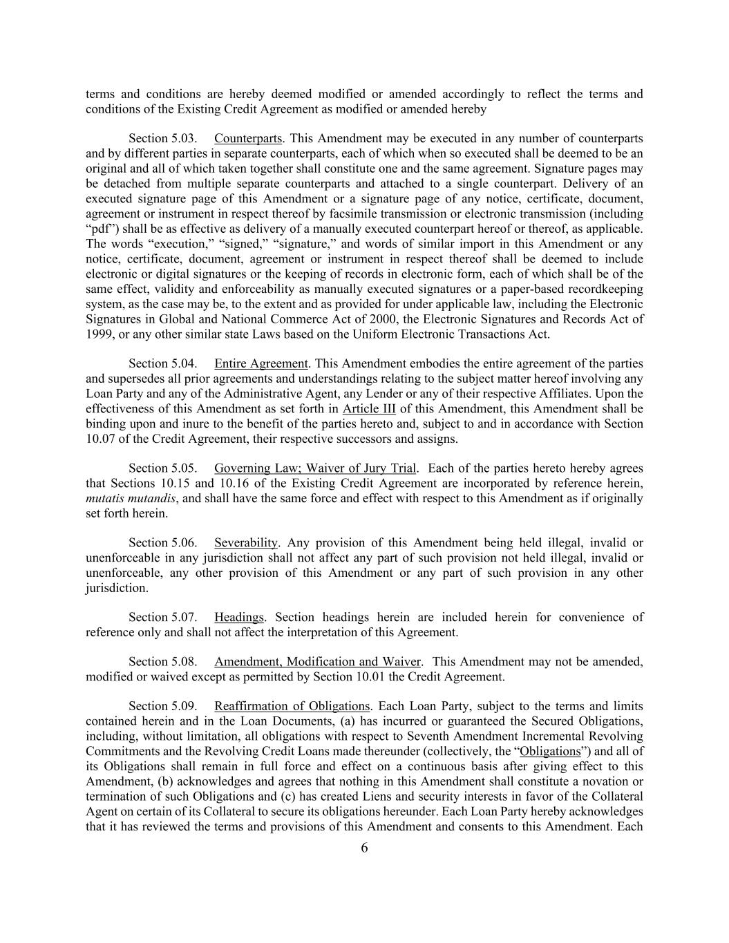 6 terms and conditions are hereby deemed modified or amended accordingly to reflect the terms and conditions of the Existing Credit Agreement as modified or amended hereby Section 5.03. Counterparts. This Amendment may be executed in any number of counterparts and by different parties in separate counterparts, each of which when so executed shall be deemed to be an original and all of which taken together shall constitute one and the same agreement. Signature pages may be detached from multiple separate counterparts and attached to a single counterpart. Delivery of an executed signature page of this Amendment or a signature page of any notice, certificate, document, agreement or instrument in respect thereof by facsimile transmission or electronic transmission (including “pdf”) shall be as effective as delivery of a manually executed counterpart hereof or thereof, as applicable. The words “execution,” “signed,” “signature,” and words of similar import in this Amendment or any notice, certificate, document, agreement or instrument in respect thereof shall be deemed to include electronic or digital signatures or the keeping of records in electronic form, each of which shall be of the same effect, validity and enforceability as manually executed signatures or a paper-based recordkeeping system, as the case may be, to the extent and as provided for under applicable law, including the Electronic Signatures in Global and National Commerce Act of 2000, the Electronic Signatures and Records Act of 1999, or any other similar state Laws based on the Uniform Electronic Transactions Act. Section 5.04. Entire Agreement. This Amendment embodies the entire agreement of the parties and supersedes all prior agreements and understandings relating to the subject matter hereof involving any Loan Party and any of the Administrative Agent, any Lender or any of their respective Affiliates. Upon the effectiveness of this Amendment as set forth in Article III of this Amendment, this Amendment shall be binding upon and inure to the benefit of the parties hereto and, subject to and in accordance with Section 10.07 of the Credit Agreement, their respective successors and assigns. Section 5.05. Governing Law; Waiver of Jury Trial. Each of the parties hereto hereby agrees that Sections 10.15 and 10.16 of the Existing Credit Agreement are incorporated by reference herein, mutatis mutandis, and shall have the same force and effect with respect to this Amendment as if originally set forth herein. Section 5.06. Severability. Any provision of this Amendment being held illegal, invalid or unenforceable in any jurisdiction shall not affect any part of such provision not held illegal, invalid or unenforceable, any other provision of this Amendment or any part of such provision in any other jurisdiction. Section 5.07. Headings. Section headings herein are included herein for convenience of reference only and shall not affect the interpretation of this Agreement. Section 5.08. Amendment, Modification and Waiver. This Amendment may not be amended, modified or waived except as permitted by Section 10.01 the Credit Agreement. Section 5.09. Reaffirmation of Obligations. Each Loan Party, subject to the terms and limits contained herein and in the Loan Documents, (a) has incurred or guaranteed the Secured Obligations, including, without limitation, all obligations with respect to Seventh Amendment Incremental Revolving Commitments and the Revolving Credit Loans made thereunder (collectively, the “Obligations”) and all of its Obligations shall remain in full force and effect on a continuous basis after giving effect to this Amendment, (b) acknowledges and agrees that nothing in this Amendment shall constitute a novation or termination of such Obligations and (c) has created Liens and security interests in favor of the Collateral Agent on certain of its Collateral to secure its obligations hereunder. Each Loan Party hereby acknowledges that it has reviewed the terms and provisions of this Amendment and consents to this Amendment. Each