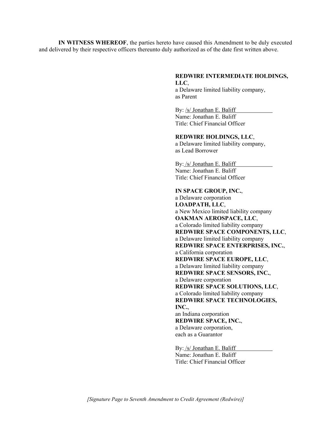 [Signature Page to Seventh Amendment to Credit Agreement (Redwire)] IN WITNESS WHEREOF, the parties hereto have caused this Amendment to be duly executed and delivered by their respective officers thereunto duly authorized as of the date first written above. REDWIRE INTERMEDIATE HOLDINGS, LLC, a Delaware limited liability company, as Parent By: /s/ Jonathan E. Baliff Name: Jonathan E. Baliff Title: Chief Financial Officer REDWIRE HOLDINGS, LLC, a Delaware limited liability company, as Lead Borrower By: /s/ Jonathan E. Baliff Name: Jonathan E. Baliff Title: Chief Financial Officer IN SPACE GROUP, INC., a Delaware corporation LOADPATH, LLC, a New Mexico limited liability company OAKMAN AEROSPACE, LLC, a Colorado limited liability company REDWIRE SPACE COMPONENTS, LLC, a Delaware limited liability company REDWIRE SPACE ENTERPRISES, INC., a California corporation REDWIRE SPACE EUROPE, LLC, a Delaware limited liability company REDWIRE SPACE SENSORS, INC., a Delaware corporation REDWIRE SPACE SOLUTIONS, LLC, a Colorado limited liability company REDWIRE SPACE TECHNOLOGIES, INC., an Indiana corporation REDWIRE SPACE, INC., a Delaware corporation, each as a Guarantor By: /s/ Jonathan E. Baliff Name: Jonathan E. Baliff Title: Chief Financial Officer