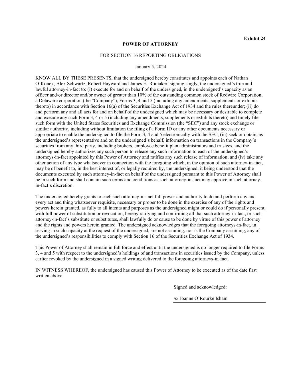 Exhibit 24 POWER OF ATTORNEY FOR SECTION 16 REPORTING OBLIGATIONS January 5, 2024 KNOW ALL BY THESE PRESENTS, that the undersigned hereby constitutes and appoints each of Nathan O’Konek, Alex Schwartz, Robert Hayward and James H. Romaker, signing singly, the undersigned’s true and lawful attorney-in-fact to: (i) execute for and on behalf of the undersigned, in the undersigned’s capacity as an officer and/or director and/or owner of greater than 10% of the outstanding common stock of Redwire Corporation, a Delaware corporation (the “Company”), Forms 3, 4 and 5 (including any amendments, supplements or exhibits thereto) in accordance with Section 16(a) of the Securities Exchange Act of 1934 and the rules thereunder; (ii) do and perform any and all acts for and on behalf of the undersigned which may be necessary or desirable to complete and execute any such Form 3, 4 or 5 (including any amendments, supplements or exhibits thereto) and timely file such form with the United States Securities and Exchange Commission (the “SEC”) and any stock exchange or similar authority, including without limitation the filing of a Form ID or any other documents necessary or appropriate to enable the undersigned to file the Form 3, 4 and 5 electronically with the SEC; (iii) seek or obtain, as the undersigned’s representative and on the undersigned’s behalf, information on transactions in the Company’s securities from any third party, including brokers, employee benefit plan administrators and trustees, and the undersigned hereby authorizes any such person to release any such information to each of the undersigned’s attorneys-in-fact appointed by this Power of Attorney and ratifies any such release of information; and (iv) take any other action of any type whatsoever in connection with the foregoing which, in the opinion of such attorney-in-fact, may be of benefit to, in the best interest of, or legally required by, the undersigned, it being understood that the documents executed by such attorney-in-fact on behalf of the undersigned pursuant to this Power of Attorney shall be in such form and shall contain such terms and conditions as such attorney-in-fact may approve in such attorney- in-fact’s discretion. The undersigned hereby grants to each such attorney-in-fact full power and authority to do and perform any and every act and thing whatsoever requisite, necessary or proper to be done in the exercise of any of the rights and powers herein granted, as fully to all intents and purposes as the undersigned might or could do if personally present, with full power of substitution or revocation, hereby ratifying and confirming all that such attorney-in-fact, or such attorney-in-fact’s substitute or substitutes, shall lawfully do or cause to be done by virtue of this power of attorney and the rights and powers herein granted. The undersigned acknowledges that the foregoing attorneys-in-fact, in serving in such capacity at the request of the undersigned, are not assuming, nor is the Company assuming, any of the undersigned’s responsibilities to comply with Section 16 of the Securities Exchange Act of 1934. This Power of Attorney shall remain in full force and effect until the undersigned is no longer required to file Forms 3, 4 and 5 with respect to the undersigned’s holdings of and transactions in securities issued by the Company, unless earlier revoked by the undersigned in a signed writing delivered to the foregoing attorneys-in-fact. IN WITNESS WHEREOF, the undersigned has caused this Power of Attorney to be executed as of the date first written above. Signed and acknowledged: /s/ Joanne O’Rourke Isham