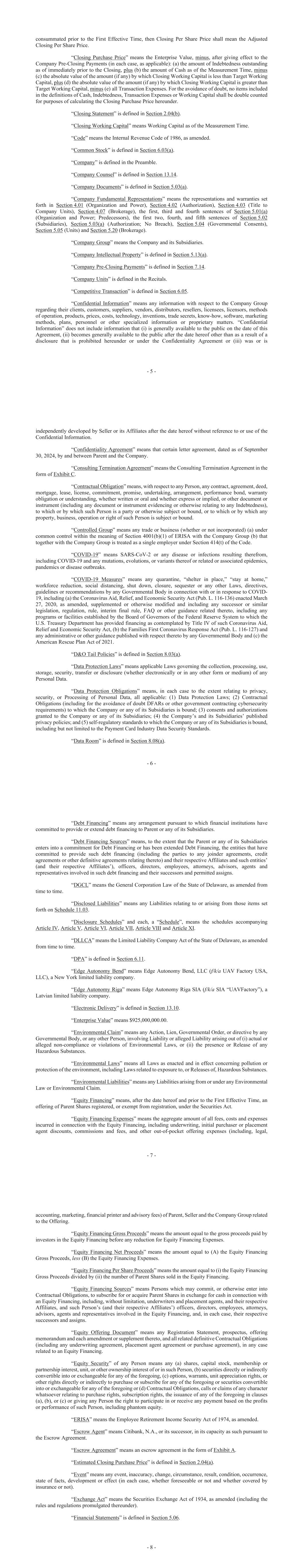 - 13 - “Intellectual Property” means intellectual property rights in all of the following in any jurisdiction throughout the world whether registered, unregistered, or applied for: (a) patents, patent applications, including any reissues, divisionals, continuations, continuations-in-part and extensions and counterparts thereof; (b) trademarks, service marks, trade dress, corporate names, logos and slogans, together with all goodwill associated with each of the foregoing (collectively “Trademarks”); (c) copyrights and copyrightable works; (d) registrations and applications for any of the foregoing; (e) Trade Secrets, proprietary information, know-how and inventions; (f) Internet domain names; and (g) Software (including Source Code, executable code, data, and databases). “Intended Tax Treatment” is defined in Section 12.09. “Interim Financial Statements” is defined in Section 5.06. “Intermediate II” means Edge Autonomy Intermediate II Holdings, LLC, a Delaware limited liability company. “Intervening Event” means a material change of circumstances, event or development with respect to the business, assets, operations or financial position of Parent and its subsidiaries, taken as a whole, that first occurs or would reasonably be expected to occur after the date of this Agreement that was not known to the Board of Directors (or, if known, the consequences of which were not reasonably foreseeable to the Board of Directors), in either case, as of or prior to the date of this Agreement; provided, that in no event shall any of the following events, changes or developments constitute or be taken into account in determining an Intervening Event: (a) any change (in and of itself) in the price or trading volume of Parent’s equity securities, (b) any development or change in the industries in which Parent and its Subsidiaries operate unless it has a material and disproportionate effect on Parent and its Subsidiaries taken as a whole, or (c) the fact in and of itself that Parent or any of its Subsidiaries meets or exceeds internal or published projections; provided, that the underlying causes of any of the foregoing in clauses (a), (b) or (c) may be considered and taken into account in determining whether an Intervening Event has occurred or would reasonably be expected to occur. “Investment” means (a) any direct or indirect ownership, purchase or other acquisition by a Person of any notes, obligations, instruments or Equity Securities (including joint venture interests) of any other Person; and (b) any capital contribution or similar obligation by a Person to any other Person. “IRS” means the U.S. Internal Revenue Service. “Issuer Agreement” is defined in Section 10.05. “JAMS Rules” is defined in Section 13.12(a). “K&E” means Kirkland & Ellis LLP. “Knowledge” means, with respect to the Company, (a) the actual knowledge of Joshua Brungardt, Steve Adlich, Scott Kirk, Joshua Stinson, Allen Gardner, Sam Miller, Michael Edison, Aidas and, (b) the constructive knowledge that each such Person would acquire after reasonable inquiry of such Person’s direct reports and had such Person conducted a reasonable investigation. “Latest Balance Sheet” is defined in Section 5.06. - 14 - “Latvian Repatriation Amount” means an aggregate amount equal to (x) if the aggregate value (in dollars) of all cash held by Edge Autonomy Riga as of the Measurement Time (such amount, the “Riga Cash Balance”) is less than or equal to $7,500,000, then zero dollars ($0), or (y) to the extent the Riga Cash Balance is greater than $7,500,000, then one hundred percent (100%) of the amount of such excess over $7,500,000. “Law” means any law, act, statute, ordinance, code, rule, constitution, treaty, regulation, Governmental Order or other pronouncement having the effect of law of any Governmental Body. “Lease” or “Leases” is defined in Section 5.10(c). “Leased Real Property” is defined in Section 5.10(c). “Liability” means any Indebtedness, liability, claim, Action, loss, damage, deficiency, Contractual Obligation or judgment of any kind, character or description, known or unknown (whether asserted or unasserted, whether direct or indirect, whether absolute or contingent, whether accrued or unaccrued, whether secured or unsecured, whether liquidated or unliquidated, whether fixed or variable, whether disputed or undisputed, whether disclosed or undisclosed, whether incurred or consequential, whether joint or several, vested or unvested, whether choate or inchoate, whether perfected or unperfected, whether matured or unmatured, whether determinable or undeterminable and whether due or to become due), including any liability for Taxes or other governmental charges or Actions, in all cases whether or not of a kind required by GAAP to be set forth on a financial statement and regardless of whether immediately due and payable, and including all costs and expenses related thereto. “Liens” means any mortgages, liens, pledges, charges, security interests, leases, licenses, conditional sale or other buy/sell Contractual Obligations or other title retention Contractual Obligations, options, rights of way, easements, charges, community or other marital property interests, equitable interests, hypothecations, encroachments, servitudes, rights of first offer or first refusal and any other encumbrance or restriction or covenant with respect to, or condition governing the use, construction, voting (in the case of any security or equity interest), transfer, receipt of income or exercise of any other attribute of ownership or encumbrances of any kind. “LLC Agreement” means that certain Amended and Restated Limited Liability Company Agreement of the Company, dated as of March 11, 2022, as amended from time to time in accordance with its terms. “LMC” is defined in Schedule 5.13(a). “Lookback Date” means January 27, 2021. “Losses” is defined in Section 11.03