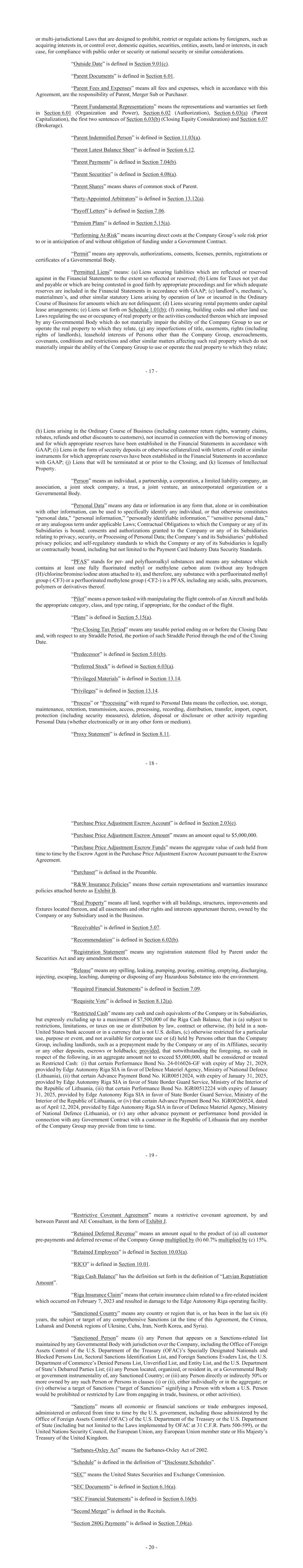 - 21 - “Securities Act” means the Securities Act of 1933, as amended (including the rules and regulations promulgated thereunder). “Security Incident” means any (i) unauthorized or unlawful acquisition of, access to, or loss of Sensitive Data of the Company or any of its Subsidiaries; (ii) unauthorized Processing, sale or rental of Personal Data by the Company or any of its Subsidiaries; (iii) ransomware, phishing or other cyberattack that resulted in a monetary loss or a business disruption to the Company’s or any of its Subsidiaries’ information technology systems; or (iv) other cyber or security incident that compromises the security, confidentiality or integrity, or availability of Sensitive Data of the Company or any of its Subsidiaries or the Company’s or any of its Subsidiaries’ information technology systems. “Seller” is defined in the Preamble. “Seller Adjustment Amount” is defined in Section 2.04(h)(ii). “Seller Documents” is defined in Section 4.01. “Sensitive Data” means non-public Personal Data, confidential Trade Secret information or other confidential or proprietary data of the Company or any of its Subsidiaries. “Software” means any and all (i) computer programs, firmware, and software implementations of algorithms, models and methodologies, whether in Source Code or Object Code; (ii) databases and compilations, including any and all data and collections of data, whether machine readable or otherwise; and (iii) all related documentation and materials, including Source Code, Object Code, code repositories, development tools, application programming interfaces, user interfaces, architecture, files, manuals, programmers’ notes, derivative works, foreign language versions, fixes, upgrades, updates, enhancements, current and prior versions and releases. “Sorainen” means Sorainen ZAB SIA. “Source Code” means computer software code, in form other than Object Code or machine readable form, including related programmer comments and annotations, help text, data and data structures, instructions and procedural, object-oriented and other code, which may be printed out or displayed in human readable form. “Special Committee” is defined in the Recitals. “State of Registration” means (i) the United States, or (ii) such other state of registration of the Aircraft owned by Seller. “Stock Exchange” means, at any applicable time, the New York Stock Exchange or any other stock exchange on which the Parent Shares are then traded. “Stock Issuance” is defined in Section 6.02(b). “Stockholders Meeting” is defined in Section 8.12(a). “Straddle Period” means a taxable period beginning on or before the Closing Date and ending after the Closing Date. - 22 - “Subsidiary” means, with respect to any Person, any corporation of which a majority of the total voting power of shares of stock entitled (without regard to the occurrence of any contingency) to vote in the election of directors, managers or trustees thereof is at the time owned or controlled, directly or indirectly, by such Person or one (1) or more of the other Subsidiaries of such Person or a combination thereof, or any partnership, association or other business entity of which a majority of the partnership or other similar ownership interest is at the time owned or controlled, directly or indirectly, by such Person or one (1) or more Subsidiaries of such Person or a combination thereof. For purposes of this definition, a Person is deemed to have a majority ownership interest in a partnership, association or other business entity if such Person is allocated a majority of the gains or losses of such partnership, association or other business entity or is or controls the managing director or general partner of such partnership, association or other business entity. “Target Working Capital” means $47,054,707.50. “Tax” means (i) any federal, state, local, or municipal, or non-U.S. taxes, including income, gross receipts, franchise, estimated, alternative minimum, add-on minimum, sales, use, transfer, real property gains, registration, unclaimed property or abandoned property or escheat, value added, excise, natural resources, net investment income, severance, stamp, occupation, windfall or other profits, environmental, customs, duties, real property, personal property, capital stock, social security (or similar), unemployment, disability, payroll, license, employee, withholding, premium, ad valorem, intangible, recording, proceeds, lease, goods and services, interest equalization, turnover, healthcare, branch, capital gains, capital, net worth, production, employer health, or other tax, duty, fee, levy, impost or other governmental charge or assessment imposed by a Governmental Body in the nature of a Tax, including any interest, penalties or additions to tax in respect of the foregoing, in each case whether disputed or not and (ii) any Liability for the payment of any amounts of the type described in clause (i) of this definition as a result of being a member of an affiliated, consolidated, combined or unitary group for any period, as a result of any tax sharing or tax allocation agreement or arrangement, or as a result of being liable for another Person’s taxes as a transferee or successor, by Contractual Obligation or otherwise. “Tax Refund” is defined in Section 12.08. “Tax Returns” means any return, declaration, report, claims for refund, information return, estimate or other document (including any supporting schedules, statements or information, and including any amendments thereto) filed or required to be filed with a Governmental Body in connection with the determination, assessment or collection of Taxes of any Person or the administration of any Laws relating to any Taxes. “Tenant Improvement Project Reimbursements” is defined in Section 8.14. “Termination Fee” is defined in Section 9.02(b). “Third Party Claim” is defined in Section 