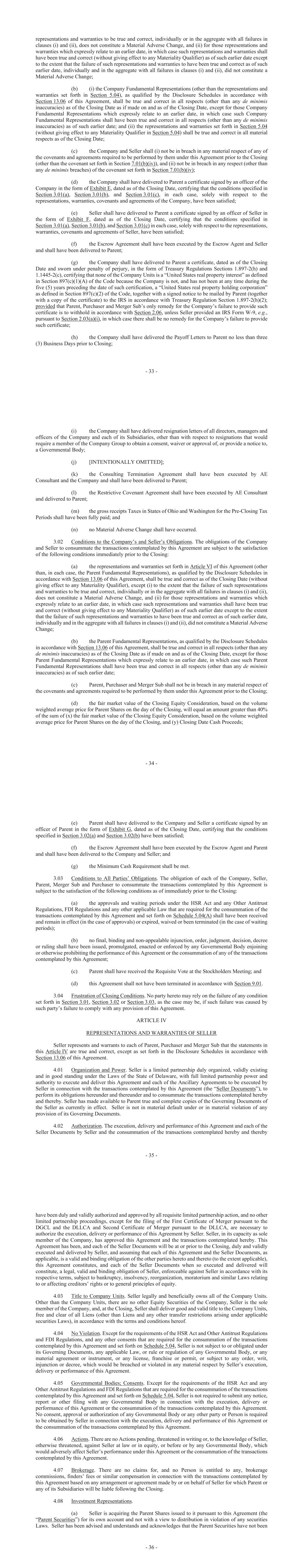 - 33 - representations and warranties to be true and correct, individually or in the aggregate with all failures in clauses (i) and (ii), does not constitute a Material Adverse Change, and (ii) for those representations and warranties which expressly relate to an earlier date, in which case such representations and warranties shall have been true and correct (without giving effect to any Materiality Qualifier) as of such earlier date except to the extent that the failure of such representations and warranties to have been true and correct as of such earlier date, individually and in the aggregate with all failures in clauses (i) and (ii), did not constitute a Material Adverse Change; (b) (i) the Company Fundamental Representations (other than the representations and warranties set forth in Section 5.04), as qualified by the Disclosure Schedules in accordance with Section 13.06 of this Agreement, shall be true and correct in all respects (other than any de minimis inaccuracies) as of the Closing Date as if made on and as of the Closing Date, except for those Company Fundamental Representations which expressly relate to an earlier date, in which case such Company Fundamental Representations shall have been true and correct in all respects (other than any de minimis inaccuracies) as of such earlier date; and (ii) the representations and warranties set forth in Section 5.04 (without giving effect to any Materiality Qualifier in Section 5.04) shall be true and correct in all material respects as of the Closing Date; (c) the Company and Seller shall (i) not be in breach in any material respect of any of the covenants and agreements required to be performed by them under this Agreement prior to the Closing (other than the covenant set forth in Section 7.01(b)(iv)), and (ii) not be in breach in any respect (other than any de minimis breaches) of the covenant set forth in Section 7.01(b)(iv); (d) the Company shall have delivered to Parent a certificate signed by an officer of the Company in the form of Exhibit E, dated as of the Closing Date, certifying that the conditions specified in Section 3.01(a), Section 3.01(b), and Section 3.01(c), in each case, solely with respect to the representations, warranties, covenants and agreements of the Company, have been satisfied; (e) Seller shall have delivered to Parent a certificate signed by an officer of Seller in the form of Exhibit F, dated as of the Closing Date, certifying that the conditions specified in Section 3.01(a), Section 3.01(b), and Section 3.01(c) in each case, solely with respect to the representations, warranties, covenants and agreements of Seller, have been satisfied; (f) the Escrow Agreement shall have been executed by the Escrow Agent and Seller and shall have been delivered to Parent; (g) the Company shall have delivered to Parent a certificate, dated as of the Closing Date and sworn under penalty of perjury, in the form of Treasury Regulations Sections 1.897-2(h) and 1.1445-2(c), certifying that none of the Company Units is a “United States real property interest” as defined in Section 897(c)(1)(A) of the Code because the Company is not, and has not been at any time during the five (5) years preceding the date of such certification, a “United States real property holding corporation” as defined in Section 897(c)(2) of the Code, together with a signed notice to be mailed by Parent (together with a copy of the certificate) to the IRS in accordance with Treasury Regulation Section 1.897-2(h)(2); provided that Parent, Purchaser and Merger Sub’s only remedy for the Company’s failure to provide such certificate is to withhold in accordance with Section 2.06, unless Seller provided an IRS Form W-9, e.g., pursuant to Section 2.03(a)(i), in which case there shall be no remedy for the Company’s failure to provide such certificate; (h) the Company shall have delivered the Payoff Letters to Parent no less than three (3) Business Days prior to Closing; - 34 - (i) the Company shall have delivered resignation letters of all directors, managers and officers of the Company and each of its Subsidiaries, other than with respect to resignations that would require a member of the Company Group to obtain a consent, waiver or approval of, or provide a notice to, a Governmental Body; (j) [INTENTIONALLY OMITTED]; (k) the Consulting Termination Agreement shall have been executed by AE Consultant and the Company and shall have been delivered to Parent; (l) the Restrictive Covenant Agreement shall have been executed by AE Consultant and delivered to Parent; (m) the gross receipts Taxes in States of Ohio and Washington for the Pre-Closing Tax Periods shall have been fully paid; and (n) no Material Adverse Change shall have occurred. 3.02 Conditions to the Company’s and Seller’s Obligations. The obligations of the Company and Seller to consummate the transactions contemplated by this Agreement are subject to the satisfaction of the following conditions immediately prior to the Closing: (a) the representations and warranties set forth in Article VI of this Agreement (other than, in each case, the Parent Fundamental Representations), as qualified by the Disclosure Schedules in accordance with Section 13.06 of this Agreement, shall be true and correct as of the Closing Date (without giving effect to any Materiality Qualifier), except (i) to the extent that the failure of such representations and warranties to be true and correct, individually or in the aggregate with all failures in clauses (i) and (ii), does not constitute a Material Adverse Change, and (ii) for those representations and warranties which expressly relate to an earlier date, in which case such representations and warranties shall have been true and correct (without giving effect to any Materiality Qualifier) as of such earlier date except to the extent that the failure of such representations and warranties to have been true and correct as of such earlier date, individually and 