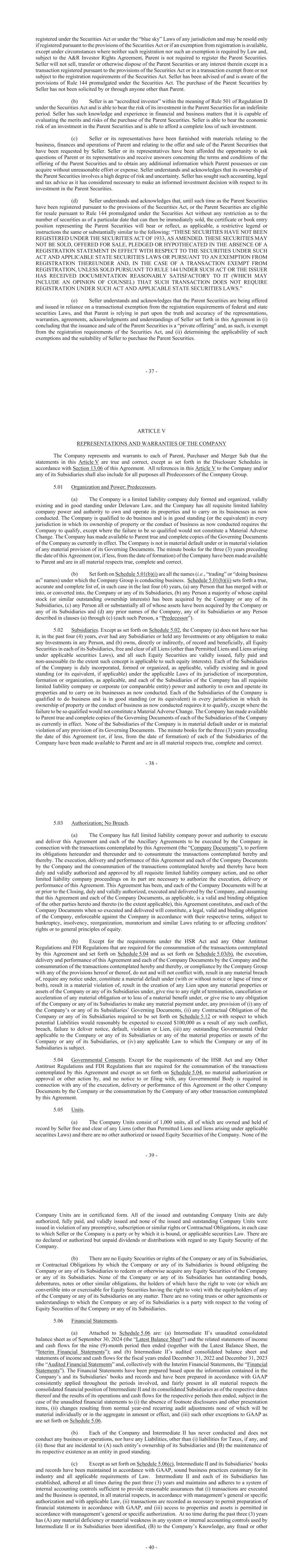 - 37 - registered under the Securities Act or under the “blue sky” Laws of any jurisdiction and may be resold only if registered pursuant to the provisions of the Securities Act or if an exemption from registration is available, except under circumstances where neither such registration nor such an exemption is required by Law and, subject to the A&R Investor Rights Agreement, Parent is not required to register the Parent Securities. Seller will not sell, transfer or otherwise dispose of the Parent Securities or any interest therein except in a transaction registered pursuant to the provisions of the Securities Act or in a transaction exempt from or not subject to the registration requirements of the Securities Act. Seller has been advised of and is aware of the provisions of Rule 144 promulgated under the Securities Act. The purchase of the Parent Securities by Seller has not been solicited by or through anyone other than Parent. (b) Seller is an “accredited investor” within the meaning of Rule 501 of Regulation D under the Securities Act and is able to bear the risk of its investment in the Parent Securities for an indefinite period. Seller has such knowledge and experience in financial and business matters that it is capable of evaluating the merits and risks of the purchase of the Parent Securities. Seller is able to bear the economic risk of an investment in the Parent Securities and is able to afford a complete loss of such investment. (c) Seller or its representatives have been furnished with materials relating to the business, finances and operations of Parent and relating to the offer and sale of the Parent Securities that have been requested by Seller. Seller or its representatives have been afforded the opportunity to ask questions of Parent or its representatives and receive answers concerning the terms and conditions of the offering of the Parent Securities and to obtain any additional information which Parent possesses or can acquire without unreasonable effort or expense. Seller understands and acknowledges that its ownership of the Parent Securities involves a high degree of risk and uncertainty. Seller has sought such accounting, legal and tax advice as it has considered necessary to make an informed investment decision with respect to its investment in the Parent Securities. (d) Seller understands and acknowledges that, until such time as the Parent Securities have been registered pursuant to the provisions of the Securities Act, or the Parent Securities are eligible for resale pursuant to Rule 144 promulgated under the Securities Act without any restriction as to the number of securities as of a particular date that can then be immediately sold, the certificate or book entry position representing the Parent Securities will bear or reflect, as applicable, a restrictive legend or instructions the same or substantially similar to the following: “THESE SECURITIES HAVE NOT BEEN REGISTERED UNDER THE SECURITIES ACT OF 1933, AS AMENDED. THESE SECURITIES MAY NOT BE SOLD, OFFERED FOR SALE, PLEDGED OR HYPOTHECATED IN THE ABSENCE OF A REGISTRATION STATEMENT IN EFFECT WITH RESPECT TO THE SECURITIES UNDER SUCH ACT AND APPLICABLE STATE SECURITIES LAWS OR PURSUANT TO AN EXEMPTION FROM REGISTRATION THEREUNDER AND, IN THE CASE OF A TRANSACTION EXEMPT FROM REGISTRATION, UNLESS SOLD PURSUANT TO RULE 144 UNDER SUCH ACT OR THE ISSUER HAS RECEIVED DOCUMENTATION REASONABLY SATISFACTORY TO IT (WHICH MAY INCLUDE AN OPINION OF COUNSEL) THAT SUCH TRANSACTION DOES NOT REQUIRE REGISTRATION UNDER SUCH ACT AND APPLICABLE STATE SECURITIES LAWS.” (e) Seller understands and acknowledges that the Parent Securities are being offered and issued in reliance on a transactional exemption from the registration requirements of federal and state securities Laws, and that Parent is relying in part upon the truth and accuracy of the representations, warranties, agreements, acknowledgments and understandings of Seller set forth in this Agreement in (i) concluding that the issuance and sale of the Parent Securities is a “private offering” and, as such, is exempt from the registration requirements of the Securities Act, and (ii) determining the applicability of such exemptions and the suitability of Seller to purchase the Parent Securities. - 38 - ARTICLE V REPRESENTATIONS AND WARRANTIES OF THE COMPANY The Company represents and warrants to each of Parent, Purchaser and Merger Sub that the statements in this Article V are true and correct, except as set forth in the Disclosure Schedules in accordance with Section 13.06 of this Agreement. All references in this Article V to the Company and/or any of its Subsidiaries shall also include for all purposes all Predecessors of the Company Group. 5.01 Organization and Power; Predecessors. (a) The Company is a limited liability company duly formed and organized, validly existing and in good standing under Delaware Law, and the Company has all requisite limited liability company power and authority to own and operate its properties and to carry on its businesses as now conducted. The Company is qualified to do business and is in good standing (or the equivalent) in every jurisdiction in which its ownership of property or the conduct of business as now conducted requires the Company to qualify, except where the failure to be so qualified would not constitute a Material Adverse Change. The Company has made available to Parent true and complete copies of the Governing Documents of the Company as currently in effect. The Company is not in material default under or in material violation of any material provision of its Governing Documents. The minute books for the three (3) years preceding the date of this Agreement (or, if less, from the date of formation) of the Company have been made available to Parent and are in all material respects true, complete and correct. (b) Set forth on Schedule 5.01(b)(i) are all the names (i.e., “trading” or “doing business as
