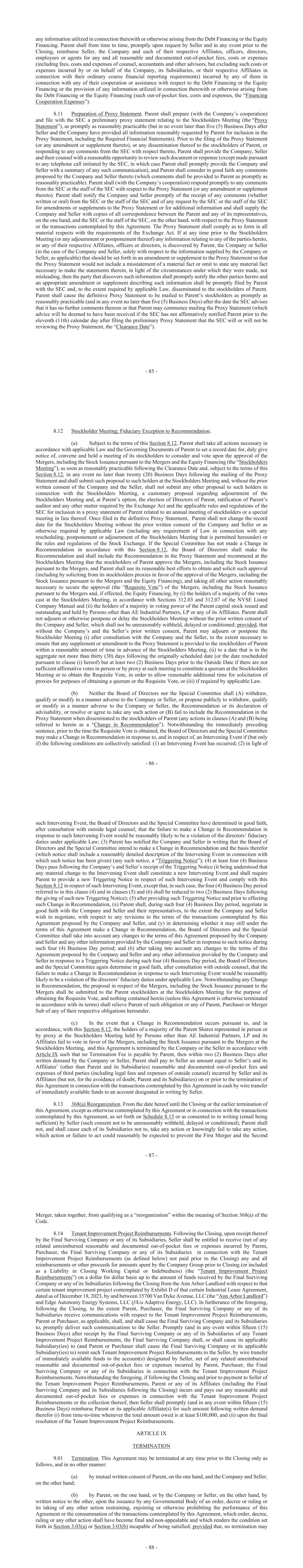- 89 - be made under this Section 9.01(b) if the issuance of such order, decree, ruling or such other action has been primarily caused by the action or inaction of the terminating party; (c) by Parent, on the one hand, or by the Company or Seller, on the other hand, by written notice to the other, if the Closing shall not have occurred on or before the date that is one hundred eighty (180) days following the date of this Agreement (the “Outside Date”); provided, however, that no termination may be made under this Section 9.01(c) if the failure to close shall have been caused by the action or inaction of the terminating party; and provided, further, that, if on the Outside Date the conditions to Closing set forth in Section 3.03(a) shall not have been satisfied or waived but all other conditions to Closing shall have been satisfied or waived (or, in the case of conditions that by their nature are to be satisfied at the Closing shall be capable of being satisfied on such date), then the Outside Date may be extended by either the Company or Seller to the date that is two hundred seventy (270) days following the date of this Agreement; (d) by Parent, Purchaser and Merger Sub, if neither Parent, Purchaser nor Merger Sub is then in material breach of this Agreement, by written notice to the Company, upon a breach of any covenant or agreement on the part of Seller or the Company set forth in this Agreement, or if any representation or warranty contained in Article IV, Article V or Article VII (only to the extent that Section 7.01(b) is incorporated by reference into Section 5.09(b)), as qualified by the Disclosure Schedules in accordance with Section 13.06 of this Agreement, shall be or have become untrue, in either case, such that any of the conditions set forth in Section 3.01(a), Section 3.01(b) or Section 3.01(c) would not be satisfied; provided, however, that, if such breach is curable, the right to terminate under this Section 9.01(d) will not be available to Parent, Purchaser or Merger Sub if Seller and the Company use reasonable best efforts to cure such breach or breaches or such failure to perform after notice thereof is delivered by Parent, Purchaser or Merger Sub to the Company or Seller, as applicable, and such breach or breaches or failure to perform, as applicable, is cured by the earlier of (x) thirty (30) days following receipt by the Company or Seller, as applicable, of written notice of such breach or failure to perform from Parent, Purchaser or Merger Sub and (y) the day which is the last Business Day prior to the Outside Date; (e) by the Company or Seller, if the Company and Seller, as applicable, are not then in material breach of this Agreement, by written notice to Parent, upon a breach of any covenant or agreement on the part of Parent, Purchaser or Merger Sub set forth in this Agreement, or if any representation or warranty of Parent, Purchaser or Merger Sub shall be or have become untrue, in either case, such that any of the conditions set forth in Section 3.02(a) or Section 3.02(b) would not be satisfied; provided, however, that if such breach is curable, the right to terminate under this Section 9.01(e) will not be available to the Company or Seller if Parent, Purchaser and Merger Sub use reasonable best efforts to cure such breach or breaches or such failure to perform after notice thereof is delivered by the Company or Seller to Parent, Purchaser or Merger Sub, as applicable, and such breach or breaches or failure to perform, as applicable, is cured by the earlier of (x) thirty (30) days following receipt by Parent, Purchaser or Merger Sub, as applicable, of written notice of such breach or failure to perform from the Company or Seller and (y) the day which is the last Business Day prior to the Outside Date; (f) by Seller, if (i) the conditions provided for in Section 3.01 and Section 3.03 have been satisfied or waived (other than those conditions that by their terms are to be satisfied at the Closing, each of which shall be capable of being satisfied if the Closing Date were the date that notice of termination is delivered by Seller to Parent), (ii) Parent, Purchaser and Merger Sub do not consummate the transactions contemplated by this Agreement by the day and time the Closing is required to occur pursuant to Section 2.02 and (iii) Seller has, at least two (2) Business Days prior to terminating this Agreement pursuant to this Section 9.01(f), irrevocably confirmed in a written notice delivered to Parent that Seller and the Company are ready, willing and able to consummate the Closing subject to conditions that by their terms - 90 - or nature are to be satisfied at the Closing, and Parent, Purchaser and Merger Sub have not consummated the Closing by the end of such two (2)-Business Day period; or (g) by either Parent or Seller if Parent fails to obtain the Requisite Vote at the Stockholders Meeting at which a vote is taken on the Mergers. 9.02 Effect of Termination. (a) If this Agreement is terminated pursuant to Section 9.01, this Agreement shall become void and of no further force and effect (other than Article I, Section 7.10, Section 8.07, Section 8.08, this Section 9.02 (including, for the avoidance of doubt, Parent’s obligations for payment of the Termination Fee pursuant to Section 9.02(b)), Section 10.01, Section 13.02, Section 13.11, Section 13.13, Section 13.15, Section 13.17 and Section 13.18, which shall survive the termination of this Agreement) without any liability or obligation on the part of any party hereto, (i) other than liabilities and obligations under the Confidentiality Agreement and (ii) except that no such termination shall relieve any party hereto of any liability for damages resulting from Fraud or any Willful Breach of this Agreement by such party. In determining losses or damages that are recoverable in accordance with this Section 9.02 upon termination by a party hereto for another party’s breach, the parties hereto acknowle