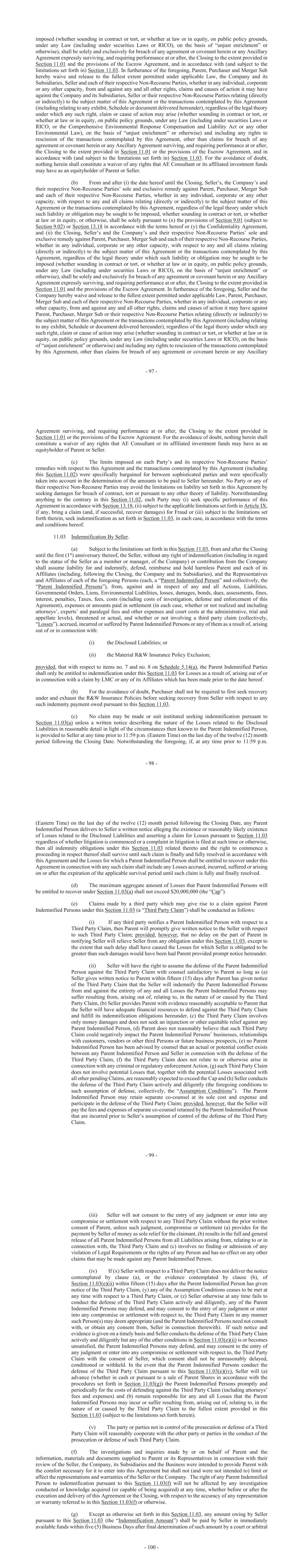 - 97 - imposed (whether sounding in contract or tort, or whether at law or in equity, on public policy grounds, under any Law (including under securities Laws or RICO), on the basis of “unjust enrichment” or otherwise), shall be solely and exclusively for breach of any agreement or covenant herein or any Ancillary Agreement expressly surviving, and requiring performance at or after, the Closing to the extent provided in Section 11.01 and the provisions of the Escrow Agreement, and in accordance with (and subject to the limitations set forth in) Section 11.03. In furtherance of the foregoing, Parent, Purchaser and Merger Sub hereby waive and release to the fullest extent permitted under applicable Law, the Company and its Subsidiaries, Seller and each of their respective Non-Recourse Parties, whether in any individual, corporate or any other capacity, from and against any and all other rights, claims and causes of action it may have against the Company and its Subsidiaries, Seller or their respective Non-Recourse Parties relating (directly or indirectly) to the subject matter of this Agreement or the transactions contemplated by this Agreement (including relating to any exhibit, Schedule or document delivered hereunder), regardless of the legal theory under which any such right, claim or cause of action may arise (whether sounding in contract or tort, or whether at law or in equity, on public policy grounds, under any Law (including under securities Laws or RICO, or the Comprehensive Environmental Response Compensation and Liability Act or any other Environmental Law), on the basis of “unjust enrichment” or otherwise) and including any rights to rescission of the transactions contemplated by this Agreement, other than claims for breach of any agreement or covenant herein or any Ancillary Agreement surviving, and requiring performance at or after, the Closing to the extent provided in Section 11.01 or the provisions of the Escrow Agreement, and in accordance with (and subject to the limitations set forth in) Section 11.03. For the avoidance of doubt, nothing herein shall constitute a waiver of any rights that AE Consultant or its affiliated investment funds may have as an equityholder of Parent or Seller. (b) From and after (i) the date hereof until the Closing, Seller’s, the Company’s and their respective Non-Recourse Parties’ sole and exclusive remedy against Parent, Purchaser, Merger Sub and each of their respective Non-Recourse Parties, whether in any individual, corporate or any other capacity, with respect to any and all claims relating (directly or indirectly) to the subject matter of this Agreement or the transactions contemplated by this Agreement, regardless of the legal theory under which such liability or obligation may be sought to be imposed, whether sounding in contract or tort, or whether at law or in equity, or otherwise, shall be solely pursuant to (x) the provisions of Section 9.01 (subject to Section 9.02) or Section 13.18 in accordance with the terms hereof or (y) the Confidentiality Agreement, and (ii) the Closing, Seller’s and the Company’s and their respective Non-Recourse Parties’ sole and exclusive remedy against Parent, Purchaser, Merger Sub and each of their respective Non-Recourse Parties, whether in any individual, corporate or any other capacity, with respect to any and all claims relating (directly or indirectly) to the subject matter of this Agreement or the transactions contemplated by this Agreement, regardless of the legal theory under which such liability or obligation may be sought to be imposed (whether sounding in contract or tort, or whether at law or in equity, on public policy grounds, under any Law (including under securities Laws or RICO), on the basis of “unjust enrichment” or otherwise), shall be solely and exclusively for breach of any agreement or covenant herein or any Ancillary Agreement expressly surviving, and requiring performance at or after, the Closing to the extent provided in Section 11.01 and the provisions of the Escrow Agreement. In furtherance of the foregoing, Seller and the Company hereby waive and release to the fullest extent permitted under applicable Law, Parent, Purchaser, Merger Sub and each of their respective Non-Recourse Parties, whether in any individual, corporate or any other capacity, from and against any and all other rights, claims and causes of action it may have against Parent, Purchaser, Merger Sub or their respective Non-Recourse Parties relating (directly or indirectly) to the subject matter of this Agreement or the transactions contemplated by this Agreement (including relating to any exhibit, Schedule or document delivered hereunder), regardless of the legal theory under which any such right, claim or cause of action may arise (whether sounding in contract or tort, or whether at law or in equity, on public policy grounds, under any Law (including under securities Laws or RICO), on the basis of “unjust enrichment” or otherwise) and including any rights to rescission of the transactions contemplated by this Agreement, other than claims for breach of any agreement or covenant herein or any Ancillary - 98 - Agreement surviving, and requiring performance at or after, the Closing to the extent provided in Section 11.01 or the provisions of the Escrow Agreement. For the avoidance of doubt, nothing herein shall constitute a waiver of any rights that AE Consultant or its affiliated investment funds may have as an equityholder of Parent or Seller. (c) The limits imposed on each Party’s and its respective Non-Recourse Parties’ remedies with respect to this Agreement and the transactions contemplated by this Agreement (including this Section 11.02) were specifically bargained for between sophisticated parties and were specifically taken into account in the determination of the amounts to be paid to Seller hereunder. No Party or any of their respective Non-Recourse Parties may avoid th