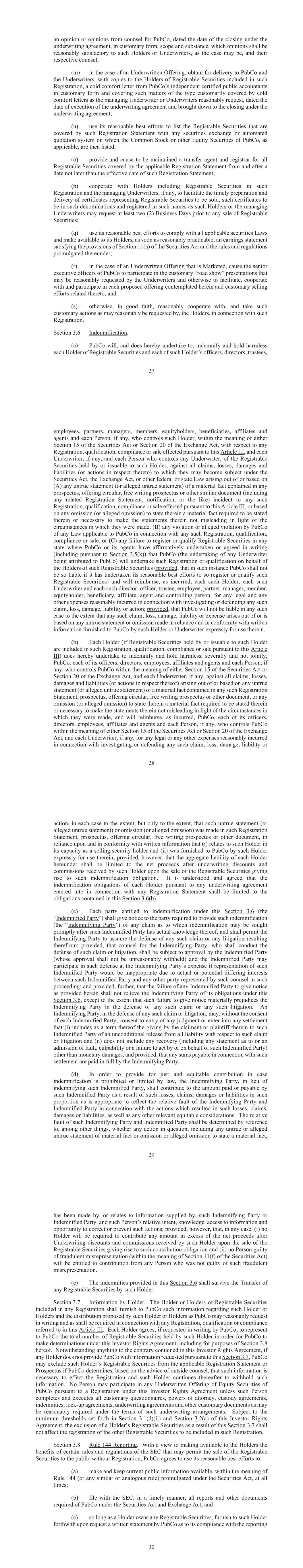 Confidential Information the use or disclosure of which could cause PubCo substantial loss and damages that could not be readily calculated and for which no remedy at Law would be adequate. Accordingly, each of the Partners and Rollover Seller covenants and agrees with PubCo that it will not (and will cause its respective controlled Affiliates and Representatives not to) at any time, except with the prior written consent of PubCo, directly or indirectly, disclose any Confidential Information known to it to any third party, unless (a) such information becomes known to the public through no fault of such Party, (b) disclosure is required by applicable Law (including any filing following the Closing Date with the SEC pursuant to applicable securities laws) or court of competent jurisdiction or requested by a Governmental Entity; provided, that (other than in the case of any required filing following the Closing Date with the SEC or in connection with any routine audit or examination as described below) such Party promptly notifies PubCo of such requirement or request and takes commercially reasonable steps, at the sole cost and expense of PubCo, to minimize the extent of any such required disclosure, (c) such information was available or becomes available to such Party before, on or after the Effective Date, without restriction, from a source (other than PubCo) without any breach of duty to PubCo or (d) such information was independently developed by such Party or its Representatives without the use of the Confidential Information. Notwithstanding the foregoing, nothing in this Investor Rights Agreement shall prohibit any of the Partners or Rollover Seller from disclosing Confidential Information (x) to any Affiliate, Representative, limited partner, member or shareholder of such Party, provided, that such Person shall be bound by an obligation of confidentiality with respect to such Confidential Information and such Party shall be responsible for any breach of this by any such Person or (y) if such disclosure is made to a governmental or regulatory authority with jurisdiction over such Party in connection with a routine audit or examination that is not specifically directed at PubCo or the Confidential Information, provided, that such Party shall request that confidential treatment be accorded to any information so disclosed. No Confidential Information shall be deemed to be provided to any Person, including any Affiliate of the Partners or Rollover Seller, unless such Confidential Information is actually provided to such Person. Furthermore, receipt of Confidential Information shall not be imputed to any Affiliate of the Partners or Rollover Seller solely by virtue of the fact that the party serves in a similar capacity for such Affiliate (a “Shared Representative”) and has received Confidential Information unless a Shared Representative (x) conveys, shares or communicates, in any manner, Confidential Information to such Affiliate or (y) participates, directly or indirectly, on behalf of such Affiliate in activities prohibited by this Agreement. ARTICLE III REGISTRATION RIGHTS Shelf Registration. (a) Filing. PubCo shall file, as soon as is reasonably practicable and in any , a Shelf Registration Statement on Form S- (and if unavailable, on Form S- covering the resale of all Registrable Securities (except as determined by PubCo pursuant to as of two Business Days prior to such filing) on a delayed or continuous basis. PubCo shall use its reasonable best efforts to cause such Shelf Registration Statement to become effective under the Securities Act as soon as practicable after such filing, but in no event later than the calendar days after the filing thereof (or, in the event the SEC reviews and has written comments to the Shelf Business Day after the date PubCo is notified (orally or in writing, whichever is earlier) by the SEC that the Shelf Registration Statement will not be “reviewed” or will not be subject to further review. PubCo shall maintain such Shelf Registration Statement in accordance with the terms of this Investor Rights Agreement, and shall prepare and file with the SEC such amendments, including post- effective amendments, and supplements as may be necessary to keep such Shelf Registration Statement continuously effective, available for use and in compliance with the provisions of the Securities Act until such time as of which all Registrable Securities registered by such Shelf Registration Statement have been sold or cease to be Registrable Securities. In the event PubCo files a Shelf Registration Statement on Form S- PubCo shall use its commercially reasonable efforts to convert such Shelf Registration Statement (and any Subsequent Shelf Registration) to a Shelf Registration Statement on Form S- soon as practicable after PubCo is eligible to use Form S- PubCo shall also use its reasonable best efforts to file any replacement or additional Shelf Registration Statement and use reasonable best efforts to cause such replacement or additional Shelf Registration Statement to become effective prior to the expiration of the initial Shelf Registration Statement filed pursuant to this . (b) Subsequent Shelf Registration. If any Shelf Registration Statement ceases to be effective under the Securities Act for any reason at any time while there remain any Registrable Securities registered by such Shelf Registration Statement, PubCo shall use its reasonable best efforts to as promptly as is reasonably practicable cause such Shelf Registration Statement to again become effective under the Securities Act (including obtaining the prompt withdrawal of any order suspending the effectiveness of such Shelf Registration Statement), and shall use its reasonable best efforts to as promptly as is reasonably practicable amend such Shelf Registration Statement in a manner reasonably expected to result in the withdrawal of any order suspending the effectiveness of such Shelf Registration Sta