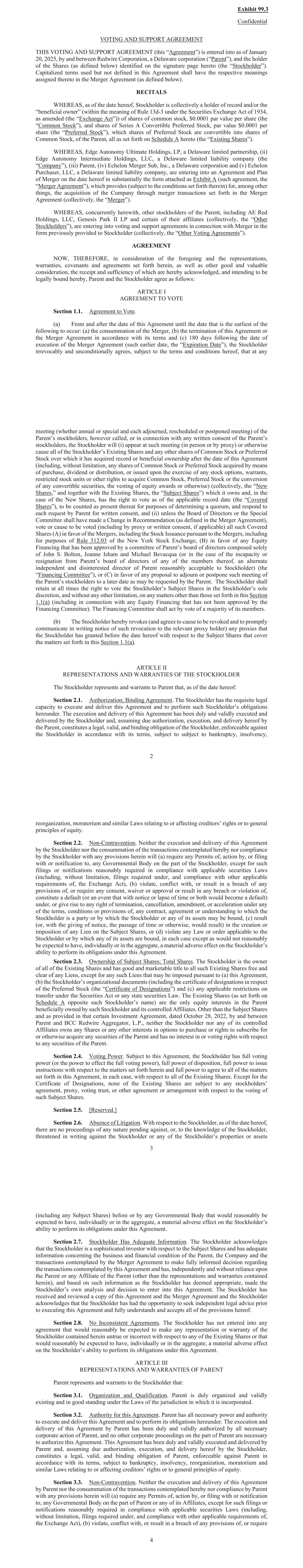 VOTING AND SUPPORT AGREEMENT THIS VOTING AND SUPPORT AGREEMENT (this “Agreement”) is entered into as of January 20, 2025, by and between Redwire Corporation, a Delaware corporation (“Parent”), and the holder of the Shares (as defined below) identified on the signature page hereto (the “Stockholder”). Capitalized terms used but not defined in this Agreement shall have the respective meanings assigned thereto in the Merger Agreement (as defined below). RECITALS WHEREAS, as of the date hereof, Stockholder is collectively a holder of record and/or the “beneficial owner” (within the meaning of Rule 13d-3 under the Securities Exchange Act of 1934, as amended (the “Exchange Act”)) of shares of common stock, $0.0001 par value per share (the “Common Stock”), and shares of Series A Convertible Preferred Stock, par value $0.0001 per share (the “Preferred Stock”), which shares of Preferred Stock are convertible into shares of Common Stock, of the Parent, all as set forth on Schedule A hereto (the “Existing Shares”). WHEREAS, Edge Autonomy Ultimate Holdings, LP, a Delaware limited partnership, (ii) Edge Autonomy Intermediate Holdings, LLC, a Delaware limited liability company (the “Company”), (iii) Parent, (iv) Echelon Merger Sub, Inc., a Delaware corporation and (v) Echelon Purchaser, LLC, a Delaware limited liability company, are entering into an Agreement and Plan of Merger on the date hereof in substantially the form attached as Exhibit A (such agreement, the “Merger Agreement”), which provides (subject to the conditions set forth therein) for, among other things, the acquisition of the Company through merger transactions set forth in the Merger Agreement (collectively, the “Merger”). WHEREAS, concurrently herewith, other stockholders of the Parent, including AE Red Holdings, LLC, Genesis Park II LP and certain of their affiliates (collectively, the “Other Stockholders”), are entering into voting and support agreements in connection with Merger in the form previously provided to Stockholder (collectively, the “Other Voting Agreements”). AGREEMENT NOW, THEREFORE, in consideration of the foregoing and the representations, warranties, covenants and agreements set forth herein, as well as other good and valuable consideration, the receipt and sufficiency of which are hereby acknowledged, and intending to be legally bound hereby, Parent and the Stockholder agree as follows: ARTICLE I AGREEMENT TO VOTE Section 1.1. Agreement to Vote. (a) From and after the date of this Agreement until the date that is the earliest of the following to occur: (a) the consummation of the Merger, (b) the termination of this Agreement or the Merger Agreement in accordance with its terms and (c) 180 days following the date of execution of the Merger Agreement (such earlier date, the “Expiration Date”), the Stockholder irrevocably and unconditionally agrees, subject to the terms and conditions hereof, that at any Confidential 2 meeting (whether annual or special and each adjourned, rescheduled or postponed meeting) of the Parent’s stockholders, however called, or in connection with any written consent of the Parent’s stockholders, the Stockholder will (i) appear at such meeting (in person or by proxy) or otherwise cause all of the Stockholder’s Existing Shares and any other shares of Common Stock or Preferred Stock over which it has acquired record or beneficial ownership after the date of this Agreement (including, without limitation, any shares of Common Stock or Preferred Stock acquired by means of purchase, dividend or distribution, or issued upon the exercise of any stock options, warrants, restricted stock units or other rights to acquire Common Stock, Preferred Stock or the conversion of any convertible securities, the vesting of equity awards or otherwise) (collectively, the “New Shares,” and together with the Existing Shares, the “Subject Shares”) which it owns and, in the case of the New Shares, has the right to vote as of the applicable record date (the “Covered Shares”), to be counted as present thereat for purposes of determining a quorum, and respond to each request by Parent for written consent, and (ii) unless the Board of Directors or the Special Committee shall have made a Change in Recommendation (as defined in the Merger Agreement), vote or cause to be voted (including by proxy or written consent, if applicable) all such Covered Shares (A) in favor of the Mergers, including the Stock Issuance pursuant to the Mergers, including for purposes of Rule 312.03 of the New York Stock Exchange, (B) in favor of any Equity Financing that has been approved by a committee of Parent’s board of directors composed solely of John S. Bolton, Joanne Isham and Michael Bevacqua (or in the case of the incapacity or resignation from Parent’s board of directors of any of the members thereof, an alternate independent and disinterested director of Parent reasonably acceptable to Stockholder) (the “Financing Committee”), or (C) in favor of any proposal to adjourn or postpone such meeting of the Parent’s stockholders to a later date as may be requested by the Parent. The Stockholder shall retain at all times the right to vote the Stockholder’s Subject Shares in the Stockholder’s sole discretion, and without any other limitation, on any matters other than those set forth in this Section 1.1(a) (including in connection with any Equity Financing that has not been approved by the Financing Committee). The Financing Committee shall act by vote of a majority of its members. (b) The Stockholder hereby revokes (and agrees to cause to be revoked and to promptly communicate in writing notice of such revocation to the relevant proxy holder) any proxies that the Stockholder has granted before the date hereof with respect to the Subject Shares that cover the matters set forth in this Section 1.1(a). ARTICLE II REPRESENTATIONS AND WARRANTIES OF THE STOCKHOLDER 