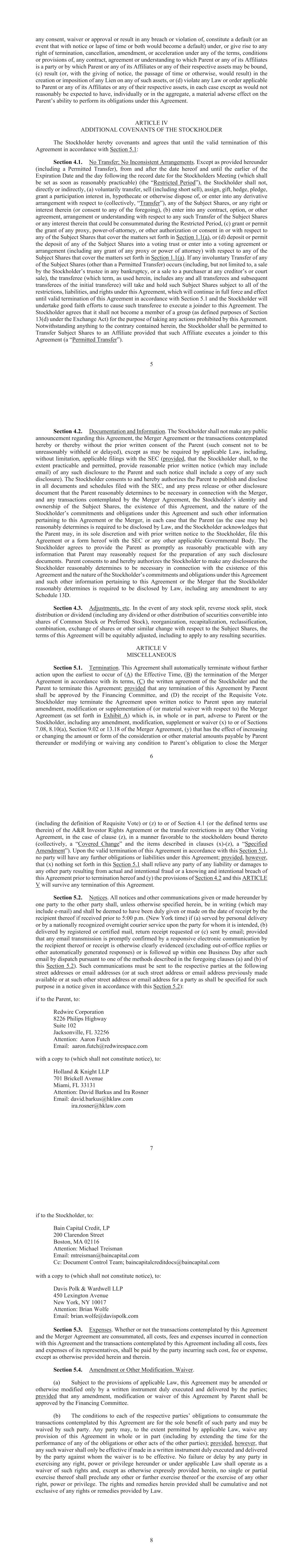 5 any consent, waiver or approval or result in any breach or violation of, constitute a default (or an event that with notice or lapse of time or both would become a default) under, or give rise to any right of termination, cancellation, amendment, or acceleration under any of the terms, conditions or provisions of, any contract, agreement or understanding to which Parent or any of its Affiliates is a party or by which Parent or any of its Affiliates or any of their respective assets may be bound, (c) result (or, with the giving of notice, the passage of time or otherwise, would result) in the creation or imposition of any Lien on any of such assets, or (d) violate any Law or order applicable to Parent or any of its Affiliates or any of their respective assets, in each case except as would not reasonably be expected to have, individually or in the aggregate, a material adverse effect on the Parent’s ability to perform its obligations under this Agreement. ARTICLE IV ADDITIONAL COVENANTS OF THE STOCKHOLDER The Stockholder hereby covenants and agrees that until the valid termination of this Agreement in accordance with Section 5.1: Section 4.1. No Transfer; No Inconsistent Arrangements. Except as provided hereunder (including a Permitted Transfer), from and after the date hereof and until the earlier of the Expiration Date and the day following the record date for the Stockholders Meeting (which shall be set as soon as reasonably practicable) (the “Restricted Period”), the Stockholder shall not, directly or indirectly, (a) voluntarily transfer, sell (including short sell), assign, gift, hedge, pledge, grant a participation interest in, hypothecate or otherwise dispose of, or enter into any derivative arrangement with respect to (collectively, “Transfer”), any of the Subject Shares, or any right or interest therein (or consent to any of the foregoing), (b) enter into any contract, option, or other agreement, arrangement or understanding with respect to any such Transfer of the Subject Shares or any interest therein that could be consummated during the Restricted Period, (c) grant or permit the grant of any proxy, power-of-attorney, or other authorization or consent in or with respect to any of the Subject Shares that cover the matters set forth in Section 1.1(a), or (d) deposit or permit the deposit of any of the Subject Shares into a voting trust or enter into a voting agreement or arrangement (including any grant of any proxy or power of attorney) with respect to any of the Subject Shares that cover the matters set forth in Section 1.1(a). If any involuntary Transfer of any of the Subject Shares (other than a Permitted Transfer) occurs (including, but not limited to, a sale by the Stockholder’s trustee in any bankruptcy, or a sale to a purchaser at any creditor’s or court sale), the transferee (which term, as used herein, includes any and all transferees and subsequent transferees of the initial transferee) will take and hold such Subject Shares subject to all of the restrictions, liabilities, and rights under this Agreement, which will continue in full force and effect until valid termination of this Agreement in accordance with Section 5.1 and the Stockholder will undertake good faith efforts to cause such transferee to execute a joinder to this Agreement. The Stockholder agrees that it shall not become a member of a group (as defined purposes of Section 13(d) under the Exchange Act) for the purpose of taking any actions prohibited by this Agreement. Notwithstanding anything to the contrary contained herein, the Stockholder shall be permitted to Transfer Subject Shares to an Affiliate provided that such Affiliate executes a joinder to this Agreement (a “Permitted Transfer”). 6 Section 4.2. Documentation and Information. The Stockholder shall not make any public announcement regarding this Agreement, the Merger Agreement or the transactions contemplated hereby or thereby without the prior written consent of the Parent (such consent not to be unreasonably withheld or delayed), except as may be required by applicable Law, including, without limitation, applicable filings with the SEC (provided, that the Stockholder shall, to the extent practicable and permitted, provide reasonable prior written notice (which may include email) of any such disclosure to the Parent and such notice shall include a copy of any such disclosure). The Stockholder consents to and hereby authorizes the Parent to publish and disclose in all documents and schedules filed with the SEC, and any press release or other disclosure document that the Parent reasonably determines to be necessary in connection with the Merger, and any transactions contemplated by the Merger Agreement, the Stockholder’s identity and ownership of the Subject Shares, the existence of this Agreement, and the nature of the Stockholder’s commitments and obligations under this Agreement and such other information pertaining to this Agreement or the Merger, in each case that the Parent (as the case may be) reasonably determines is required to be disclosed by Law, and the Stockholder acknowledges that the Parent may, in its sole discretion and with prior written notice to the Stockholder, file this Agreement or a form hereof with the SEC or any other applicable Governmental Body. The Stockholder agrees to provide the Parent as promptly as reasonably practicable with any information that Parent may reasonably request for the preparation of any such disclosure documents. Parent consents to and hereby authorizes the Stockholder to make any disclosures the Stockholder reasonably determines to be necessary in connection with the existence of this Agreement and the nature of the Stockholder’s commitments and obligations under this Agreement and such other information pertaining to this Agreement or the Merger that the Stockholder reasonably determines is required to be disclosed by Law, including any amendment to any Schedule 13D. Se
