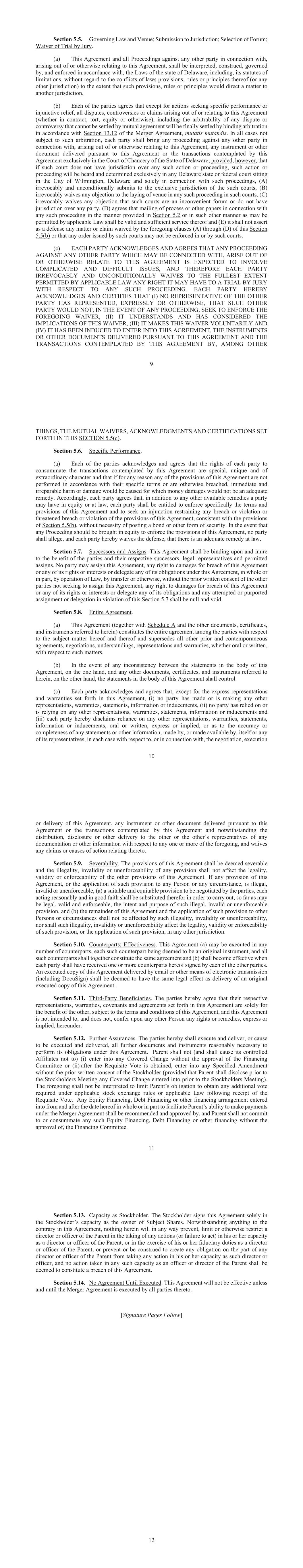 9 Section 5.5. Governing Law and Venue; Submission to Jurisdiction; Selection of Forum; Waiver of Trial by Jury. (a) This Agreement and all Proceedings against any other party in connection with, arising out of or otherwise relating to this Agreement, shall be interpreted, construed, governed by, and enforced in accordance with, the Laws of the state of Delaware, including, its statutes of limitations, without regard to the conflicts of laws provisions, rules or principles thereof (or any other jurisdiction) to the extent that such provisions, rules or principles would direct a matter to another jurisdiction. (b) Each of the parties agrees that except for actions seeking specific performance or injunctive relief, all disputes, controversies or claims arising out of or relating to this Agreement (whether in contract, tort, equity or otherwise), including the arbitrability of any dispute or controversy that cannot be settled by mutual agreement will be finally settled by binding arbitration in accordance with Section 13.12 of the Merger Agreement, mutatis mutandis. In all cases not subject to such arbitration, each party shall bring any proceeding against any other party in connection with, arising out of or otherwise relating to this Agreement, any instrument or other document delivered pursuant to this Agreement or the transactions contemplated by this Agreement exclusively in the Court of Chancery of the State of Delaware; provided, however, that if such court does not have jurisdiction over any such action or proceeding, such action or proceeding will be heard and determined exclusively in any Delaware state or federal court sitting in the City of Wilmington, Delaware and solely in connection with such proceedings, (A) irrevocably and unconditionally submits to the exclusive jurisdiction of the such courts, (B) irrevocably waives any objection to the laying of venue in any such proceeding in such courts, (C) irrevocably waives any objection that such courts are an inconvenient forum or do not have jurisdiction over any party, (D) agrees that mailing of process or other papers in connection with any such proceeding in the manner provided in Section 5.2 or in such other manner as may be permitted by applicable Law shall be valid and sufficient service thereof and (E) it shall not assert as a defense any matter or claim waived by the foregoing clauses (A) through (D) of this Section 5.5(b) or that any order issued by such courts may not be enforced in or by such courts. (c) EACH PARTY ACKNOWLEDGES AND AGREES THAT ANY PROCEEDING AGAINST ANY OTHER PARTY WHICH MAY BE CONNECTED WITH, ARISE OUT OF OR OTHERWISE RELATE TO THIS AGREEMENT IS EXPECTED TO INVOLVE COMPLICATED AND DIFFICULT ISSUES, AND THEREFORE EACH PARTY IRREVOCABLY AND UNCONDITIONALLY WAIVES TO THE FULLEST EXTENT PERMITTED BY APPLICABLE LAW ANY RIGHT IT MAY HAVE TO A TRIAL BY JURY WITH RESPECT TO ANY SUCH PROCEEDING. EACH PARTY HEREBY ACKNOWLEDGES AND CERTIFIES THAT (I) NO REPRESENTATIVE OF THE OTHER PARTY HAS REPRESENTED, EXPRESSLY OR OTHERWISE, THAT SUCH OTHER PARTY WOULD NOT, IN THE EVENT OF ANY PROCEEDING, SEEK TO ENFORCE THE FOREGOING WAIVER, (II) IT UNDERSTANDS AND HAS CONSIDERED THE IMPLICATIONS OF THIS WAIVER, (III) IT MAKES THIS WAIVER VOLUNTARILY AND (IV) IT HAS BEEN INDUCED TO ENTER INTO THIS AGREEMENT, THE INSTRUMENTS OR OTHER DOCUMENTS DELIVERED PURSUANT TO THIS AGREEMENT AND THE TRANSACTIONS CONTEMPLATED BY THIS AGREEMENT BY, AMONG OTHER 10 THINGS, THE MUTUAL WAIVERS, ACKNOWLEDGMENTS AND CERTIFICATIONS SET FORTH IN THIS SECTION 5.5(c). Section 5.6. Specific Performance. (a) Each of the parties acknowledges and agrees that the rights of each party to consummate the transactions contemplated by this Agreement are special, unique and of extraordinary character and that if for any reason any of the provisions of this Agreement are not performed in accordance with their specific terms or are otherwise breached, immediate and irreparable harm or damage would be caused for which money damages would not be an adequate remedy. Accordingly, each party agrees that, in addition to any other available remedies a party may have in equity or at law, each party shall be entitled to enforce specifically the terms and provisions of this Agreement and to seek an injunction restraining any breach or violation or threatened breach or violation of the provisions of this Agreement, consistent with the provisions of Section 5.5(b), without necessity of posting a bond or other form of security. In the event that any Proceeding should be brought in equity to enforce the provisions of this Agreement, no party shall allege, and each party hereby waives the defense, that there is an adequate remedy at law. Section 5.7. Successors and Assigns. This Agreement shall be binding upon and inure to the benefit of the parties and their respective successors, legal representatives and permitted assigns. No party may assign this Agreement, any right to damages for breach of this Agreement or any of its rights or interests or delegate any of its obligations under this Agreement, in whole or in part, by operation of Law, by transfer or otherwise, without the prior written consent of the other parties not seeking to assign this Agreement, any right to damages for breach of this Agreement or any of its rights or interests or delegate any of its obligations and any attempted or purported assignment or delegation in violation of this Section 5.7 shall be null and void. Section 5.8. Entire Agreement. (a) This Agreement (together with Schedule A and the other documents, certificates, and instruments referred to herein) constitutes the entire agreement among the parties with respect to the subject matter hereof and thereof and supersedes all other prior and contemporaneous agreements, negotiations, understandings, representations and warranties, whether oral or written, with respect to such matters. (b) In the event of any inconsistency between the statements in th