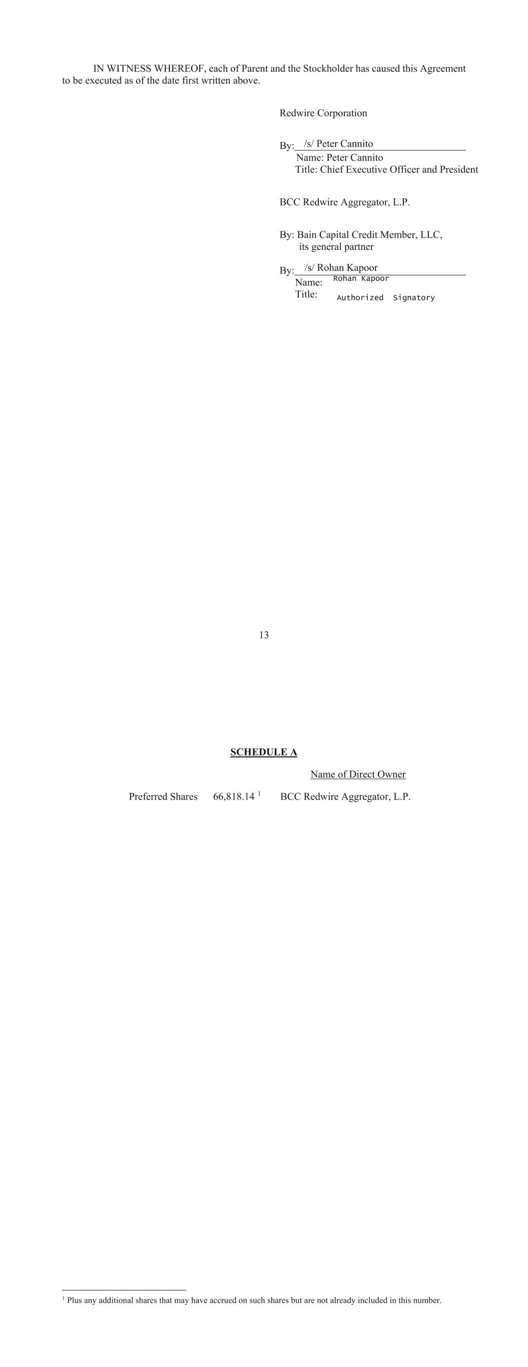 SCHEDULE A Name of Direct Owner Preferred Shares 66,818.14 1 BCC Redwire Aggregator, L.P. 1 Plus any additional shares that may have accrued on such shares but are not already included in this number.